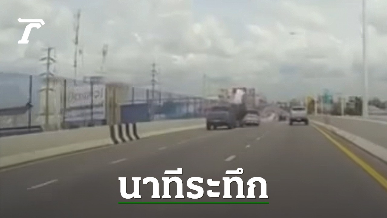 เปิดนาทีระทึก อุบัติเหตุรถเบียดกันบนเชิงทางลงสะพานข้ามวงเวียนพระราม 5 ส่งผลให้รถตกลงมาด้านล่าง 1 คัน คนขับวัย 21 บาดเจ็บ