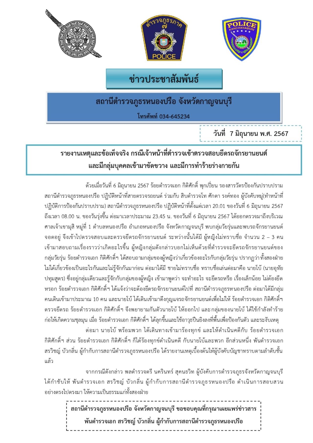 โดยล่าสุด มีรายงานว่า สถานีตำรวจภูธรหนองปรือ จังหวัดกาญจนบุรี ได้เผยแพร่รายงานเหตุและข้อเท็จจริง กรณีเจ้าหน้าที่ตำรวจเข้าตรวจสอบยึดรถจักรยานยนต์และมีกลุ่มบุคคลเข้ามาขัดขวาง และมีการทำร้ายร่างกายกัน โดยระบุว่า ด้วยเมื่อวันที่ 6 มิถุนายน 2567 ร้อยตำรวจเอก กิติศักดิ์ พุกเปี่ยน รองสารวัตรป้องกันปราบปราม สถานีตำรวจภูธรหนองปรือ ปฏิบัติหน้าที่สายตรวจรถยนต์ ร่วมกับ สิบตำรวจโท ศักดา รงค์ทอง ผู้บังคับหมู่ (ทำหน้าที่ปฏิบัติการป้องกันปราบปราม) สถานีตำรวจภูธรหนองปรือ ปฏิบัติหน้าที่ตั้งแต่เวลา 20.01 น. ของวันที่ 6 มิถุนายน 2567 ถึงเวลา 08.00 น. ของวันรุ่งขึ้น