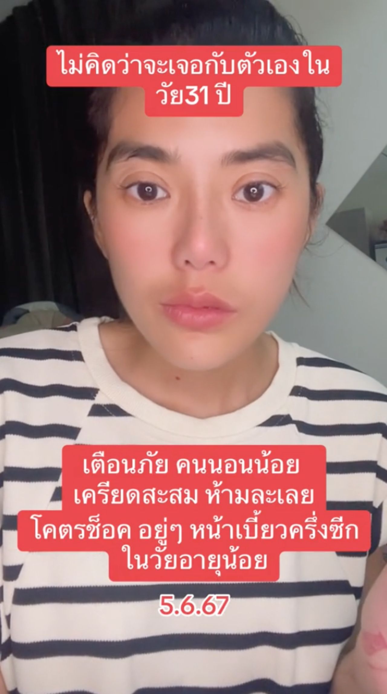 สาววัย 31 ปี เผยคลิปเตือนภัยคนนอนน้อย เครียดสะสม เผยตื่นมาตกใจ "ใบหน้าเบี้ยวครึ่งซีก" บอกก่อนมีอาการรู้สึกลิ้นชา ปวดกกหูด้านขวา
