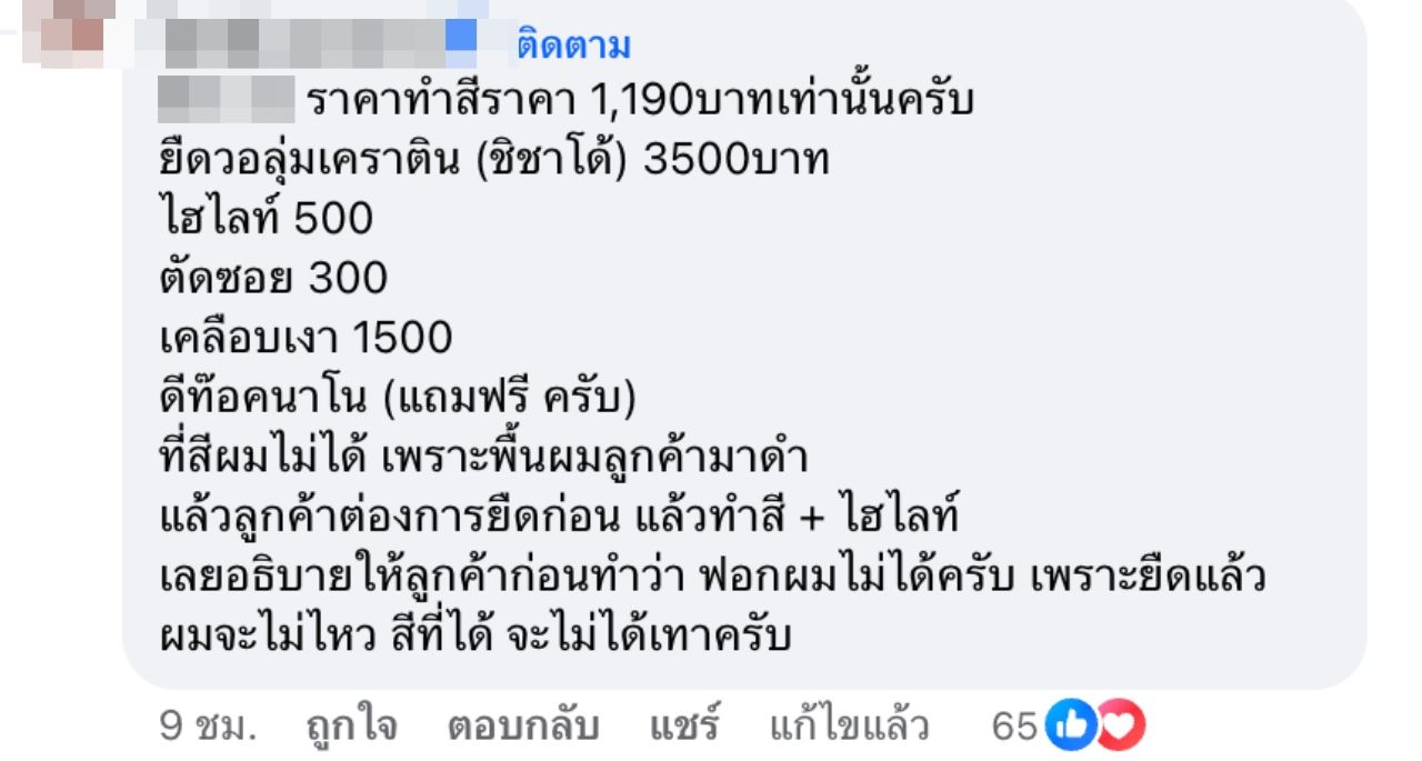 ทำให้เวลาต่อมาได้มีคนเข้ามาแสดงความคิดเห็นจำนวนมา โดยคนส่วนใหญ่มองว่า สีผมที่ได้นั้น ค่อนข้างไม่ตรงกับสีที่เจ้าของโพสต์ต้องการ นอกจากนี้ยังพบว่า ทางเจ้าของร้านได้เข้ามาชี้แจงว่า "ราคาทำสีราคา 1,190 บาทเท่านั้น และยังมีค่าอื่นๆ เช่น ยืดวอลุ่มเคราติน 3,500 บาท ไฮไลท์ 500 บาท ตัดซอย 300 บาท เคลือบเงา 1,500 บาท ดีท็อกซ์นาโน (แถมฟรี) ที่สีผมไม่ได้ เพราะพื้นผมลูกค้ามาดำแล้วลูกค้าต้องการยืดก่อน แล้วทำสี + ไฮไลท์ เลยอธิบายให้ลูกค้าก่อนทำว่า ฟอกผมไม่ได้ เพราะยืดแล้ว ผมจะไม่ไหว สีที่ได้ จะไม่ได้เทา"