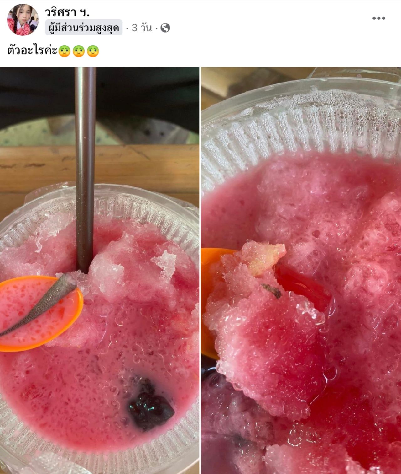 กลายเป็นโพสต์ที่ถูกพูดในโลกออนไลน์ เมื่อผู้ใช้เฟซบุ๊ก วริศรา ฯ. ได้โพสต์ภาพ "สิ่งแปลกปลอมคล้ายหางสัตว์ชนิดหนึ่ง" ขณะอยู่ในถ้วยน้ำแข็งไส ผ่านกลุ่ม พวกเราคือผู้บริโภค พร้อมระบุข้อความว่า "ตัวอะไรคะ"