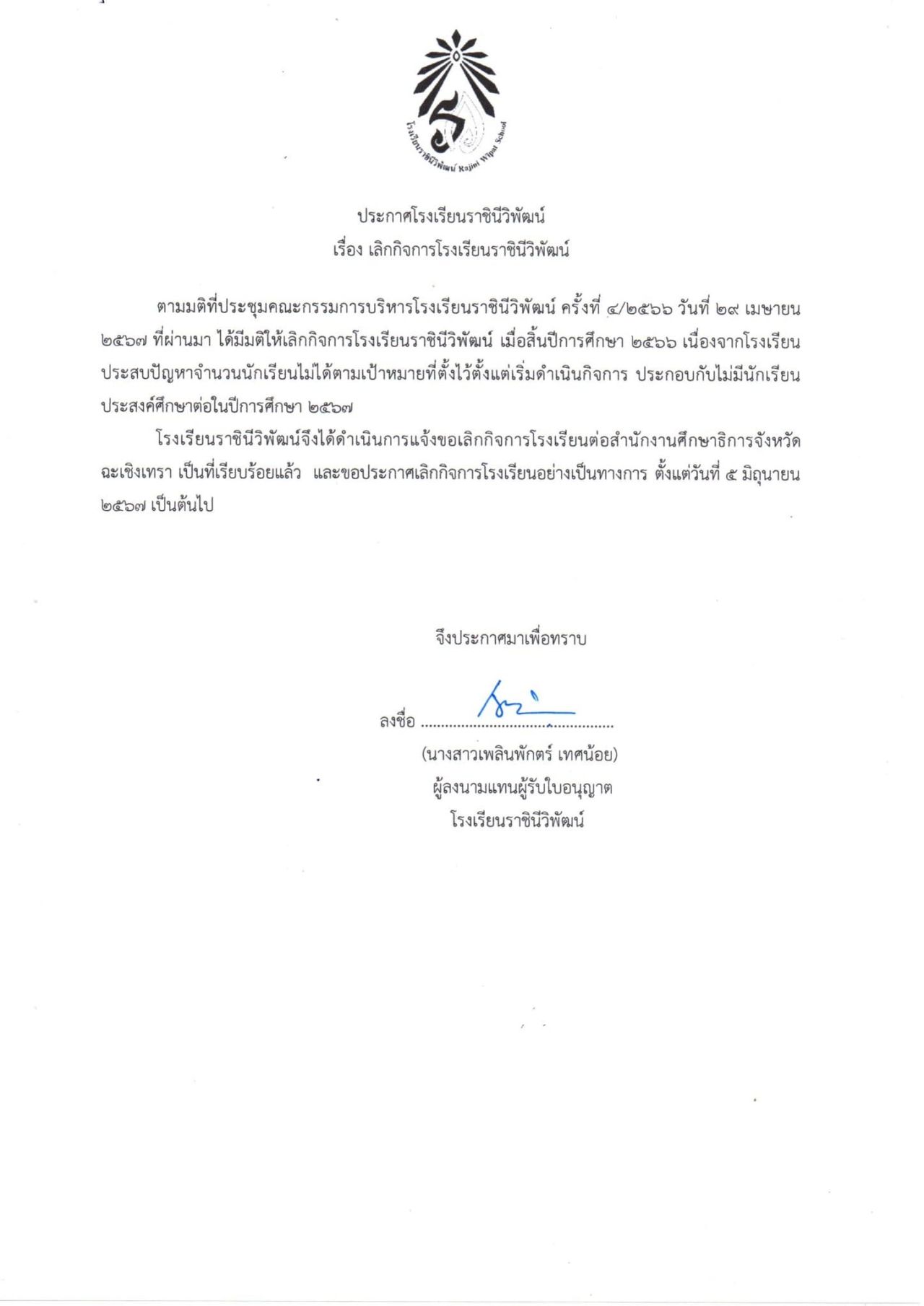 โรงเรียนราชินีวิพัฒน์ ประกาศเลิกกิจการ ประสบปัญหาจำนวนนักเรียนไม่ได้ตามเป้าหมาย กับไม่มีนักเรียนประสงค์ศึกษาต่อในปีการศึกษา 2567