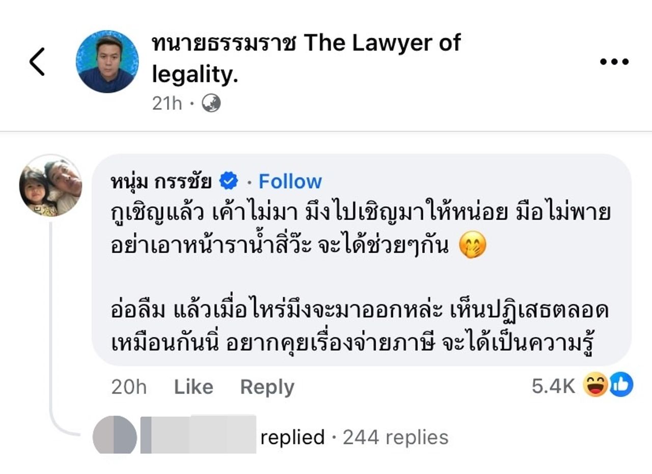 ซึ่งทาง หนุ่ม กรรชัย พิธีการรายการ ก็ได้มาตอบชัดเจนในคอมเมนต์ว่า "xูเชิญแล้ว เขาไม่มา xึงไปเชิญมาให้หน่อย มือไม่พายอย่าเอาหน้าราน้ำสิวะ จะได้ช่วยๆ กัน อ่อลืม แล้วเมื่อไร xึงจะมาออกล่ะ เห็นปฏิเสธตลอดเหมือนกันนั้ อยากคุยเรื่องจ่ายภาษี จะได้เป็นความรู้" งานนี้ทำเอาคนแห่คอมเมนต์สนั่น