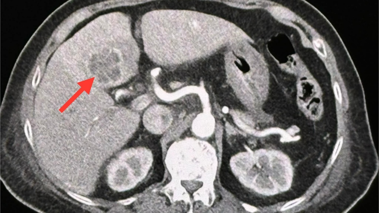 ทำอัลตราซาวนด์ช่องท้องด้านบน พบก้อนในตับข้างซ้ายขนาด 2.8 × 2.4 × 2.4 เซนติเมตร ส่งเลือดเพาะเชื้อ ขึ้นเชื้อแบคทีเรีย Klebsiella pneumoniae ทำคอมพิวเตอร์ช่องท้อง 2 วันต่อมา พบก้อนขนาด 3.3 × 3.3 × 2.8 ซม.ในตับข้างซ้าย เข้าได้กับฝีในตับ วินิจฉัย : ฝีในตับจากเชื้อแบคทีเรีย Klebsiella pneumoniae และติดเชื้อในกระแสเลือด ทำให้ช็อก ความดันต่ำ