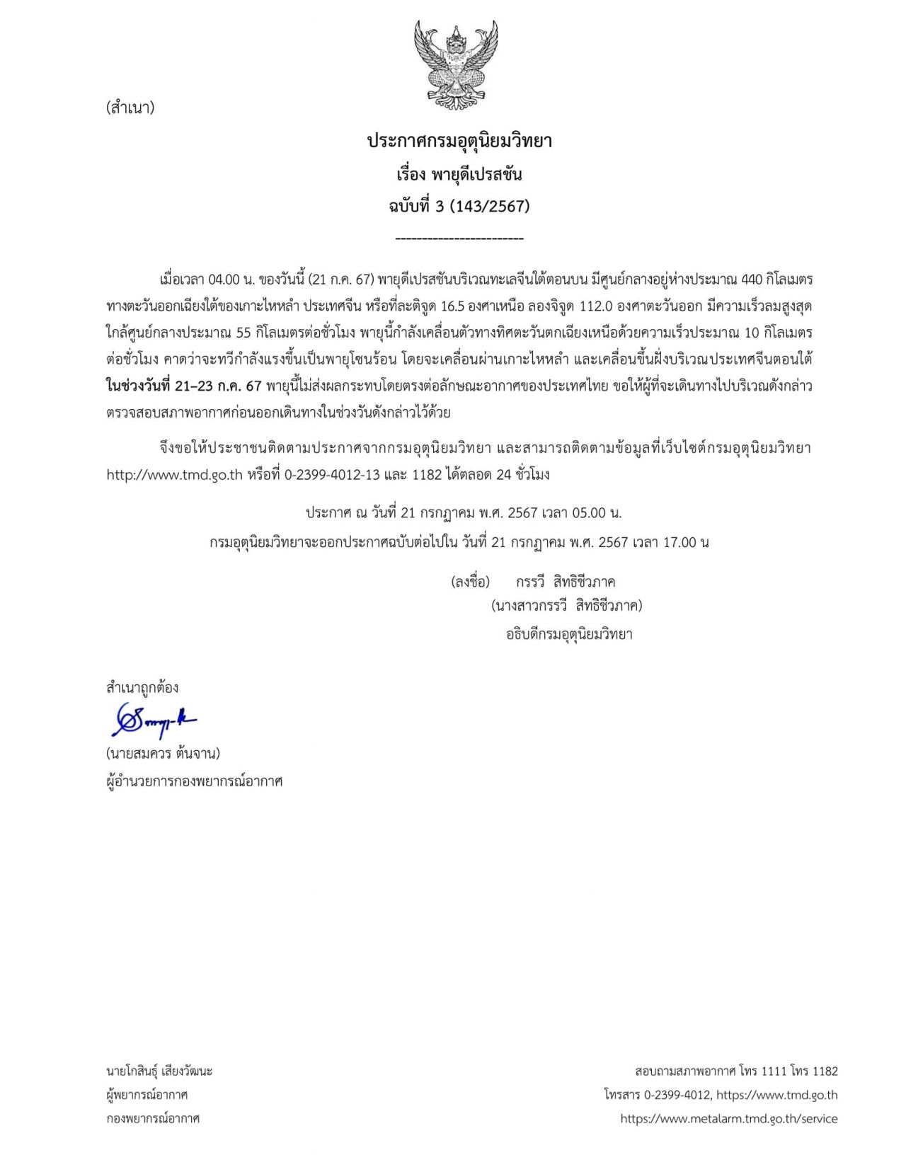 วันที่ 21 ก.ค. 67 มีรายงานว่า กรมอุตุนิยมวิทยา ประกาศเรื่อง พายุดีเปรสชัน ฉบับที่ 3 โดยระบุว่า เมื่อเวลา 04.00 น. ของวันนี้ (21 ก.ค. 67) พายุดีเปรสชันบริเวณทะเลจีนใต้ตอนบน มีศูนย์กลางอยู่ห่างประมาณ 440 กิโลเมตร ทางตะวันออกเฉียงใต้ของเกาะไหหลำ ประเทศจีน หรือที่ละติจูด 16.5 องศาเหนือ ลองจิจูด 112.0 องศาตะวันออก มีความเร็วลมสูงสุดใกล้ศูนย์กลางประมาณ 55 กิโลเมตรต่อชั่วโมง พายุนี้กำลังเคลื่อนตัวทางทิศตะวันตกเฉียงเหนือด้วยความเร็วประมาณ 10 กิโลเมตรต่อชั่วโมง คาดว่าจะทวีกำลังแรงขึ้นเป็นพายุโซนร้อน โดยจะเคลื่อนผ่านเกาะไหหลำ และเคลื่อนขึ้นฝั่งบริเวณประเทศจีนตอนใต้ในช่วงวันที่ 21-23 ก.ค. 67