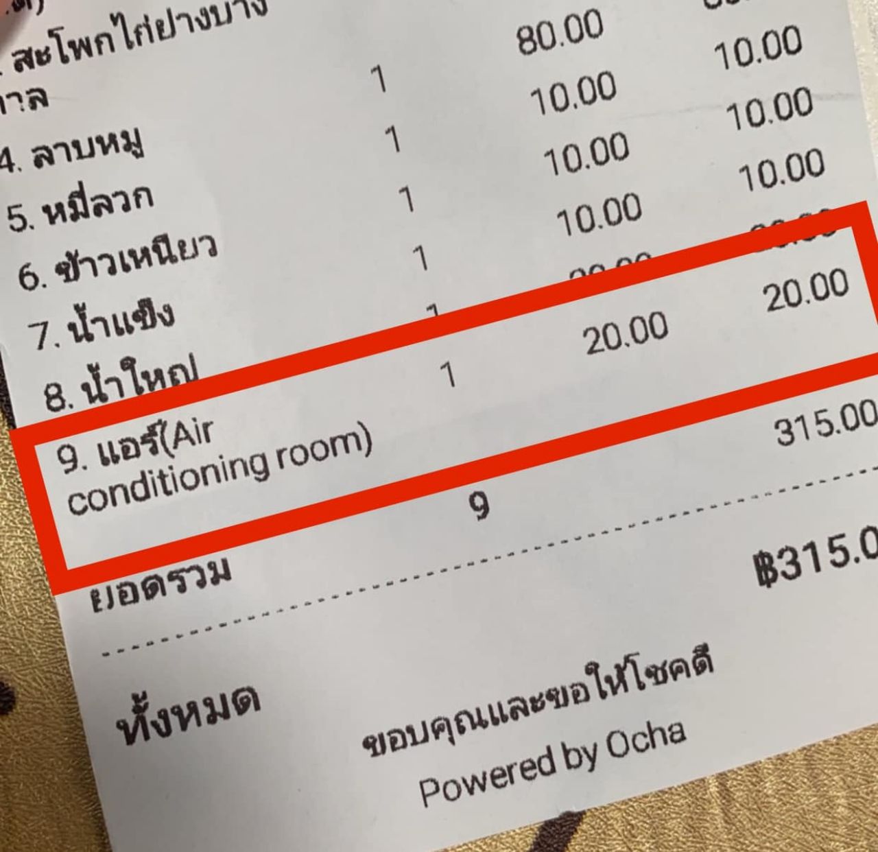 หนุ่มแปลกใจ ไปกินร้านอาหารข้างทาง เพิ่งปรับปรุงใหม่ทำโซนห้องแอร์ บิลมาเจอคิดค่าห้องแอร์ 20 บาท บอกปกติเจอแต่ Service Charge