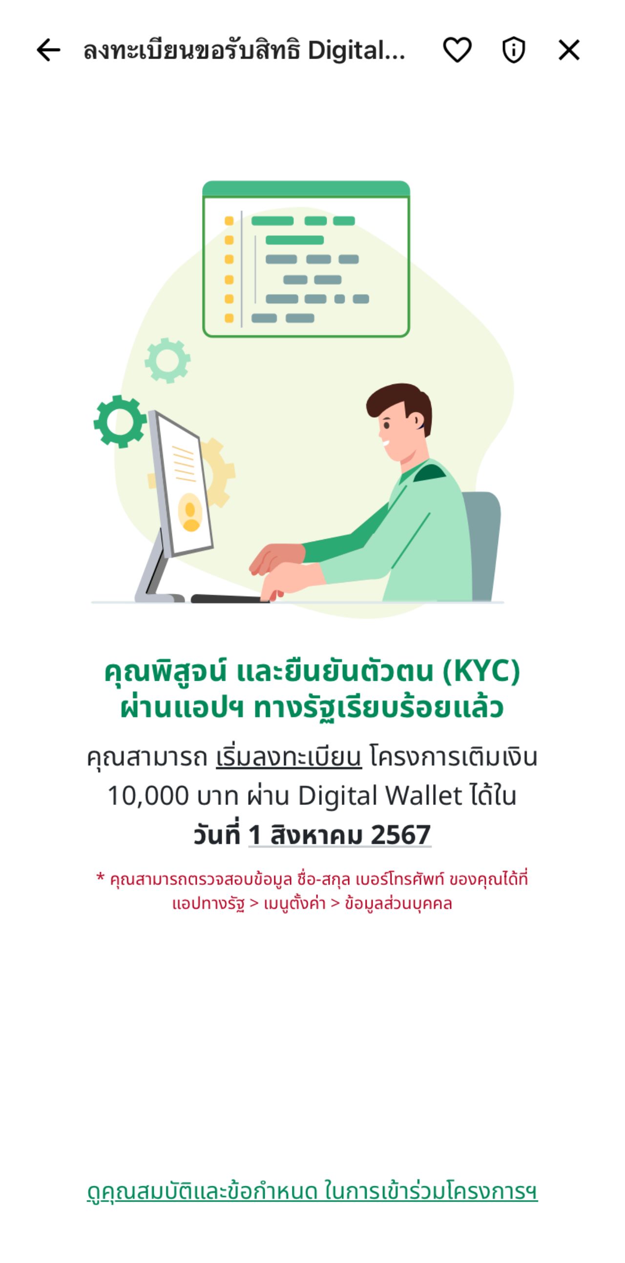 ส่วนคนที่สมัคร พิสูจน์ และยืนยันตัวตน (KYC) เข้าใช้งานแอปฯ ทางรัฐ แล้ว จะเจอหน้าจอที่แสดงผลว่า "คุณพิสูจน์และยืนยันตัวตน (KYC) ผ่านแอปฯ ทางรัฐเรียบร้อยแล้ว คุณสามารถเริ่มลงทะเบียนโครงการเติมเงิน 10,000 บาท ผ่าน Digital Wallet ได้ในวันที่ 1 สิงหาคม 2567"