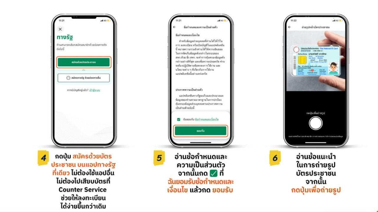 4. กดปุ่ม "สมัครด้วยบัตรประชาชน" บนแอปฯ ทางรัฐที่เดียว ไม่ต้องใช้แอปฯ อื่น ไม่ต้องไปเสียบบัตรที่ Counter Service ช่วยให้ลงทะเบียนได้ง่ายขึ้นกว่าเดิม