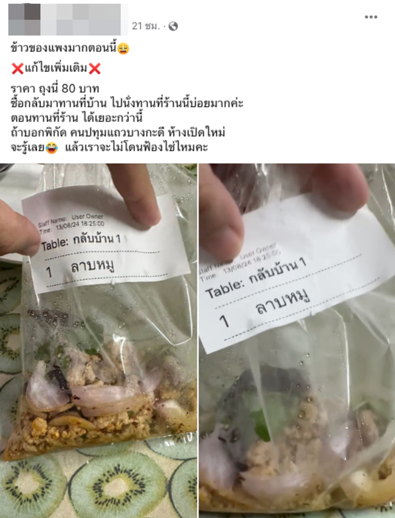 ขณะที่ เจ้าของโพสต์ดังกล่าวได้เผยข้อมูลเพิ่มเติมกับ "ทีมข่าวไทยรัฐออนไลน์" โดยระบุว่า "เคยทานอาหารร้านดังกล่าวมาแล้ว 3 ครั้ง ซึ่งปกติเวลาทานที่ร้านคือให้เยอะกว่านี้ ส่วนตอนเห็นถุงลาบหมู คือไม่ได้เห็นในร้าน เพราะว่าทางร้านใส่ถุงหิ้วเตรียมไว้ให้แล้ว คือ ส้มตำ 2 ลาบ 1 ไก่ทอด 1 เส้นเล็กลวก 2 แค่ก้มดูในถุงว่ามีครบไหม เลยไม่เห็นปริมาณอาหาร แต่รสชาติคืออร่อย สะอาด รสชาติดีมากๆ เลย สุดท้ายนี้ ในมุมของผู้บริโภคก็รู้สึกแอบน้อยใจ คือมันน้อยไปจริงๆ แตงกวา ผักเคียง ก็ไม่มีให้เลย".