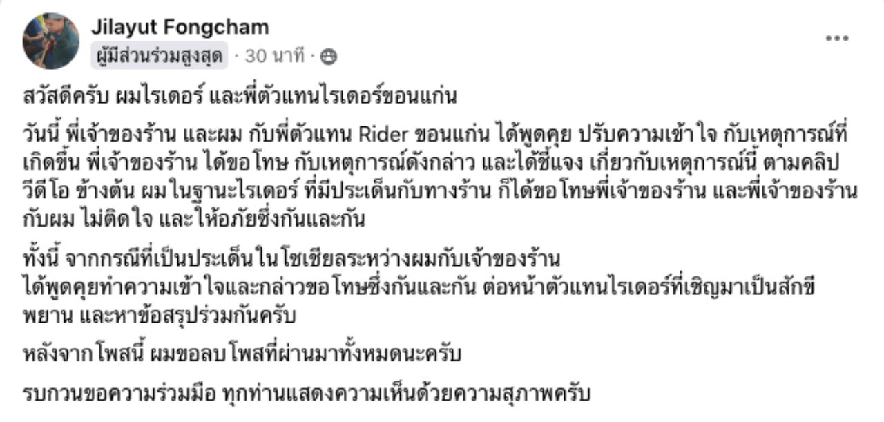 ทั้งนี้ จากกรณีที่เป็นประเด็นในโซเชียลระหว่างผมกับเจ้าของร้าน ได้พูดคุยทำความเข้าใจและกล่าวขอโทษซึ่งกันและกัน ต่อหน้าตัวแทนไรเดอร์ที่เชิญมาเป็นสักขีพยาน และหาข้อสรุปร่วมกันครับ หลังจากโพสต์นี้ ผมขอลบโพสต์ที่ผ่านมาทั้งหมดนะครับ รบกวนขอความร่วมมือทุกท่านแสดงความเห็นด้วยความสุภาพครับ