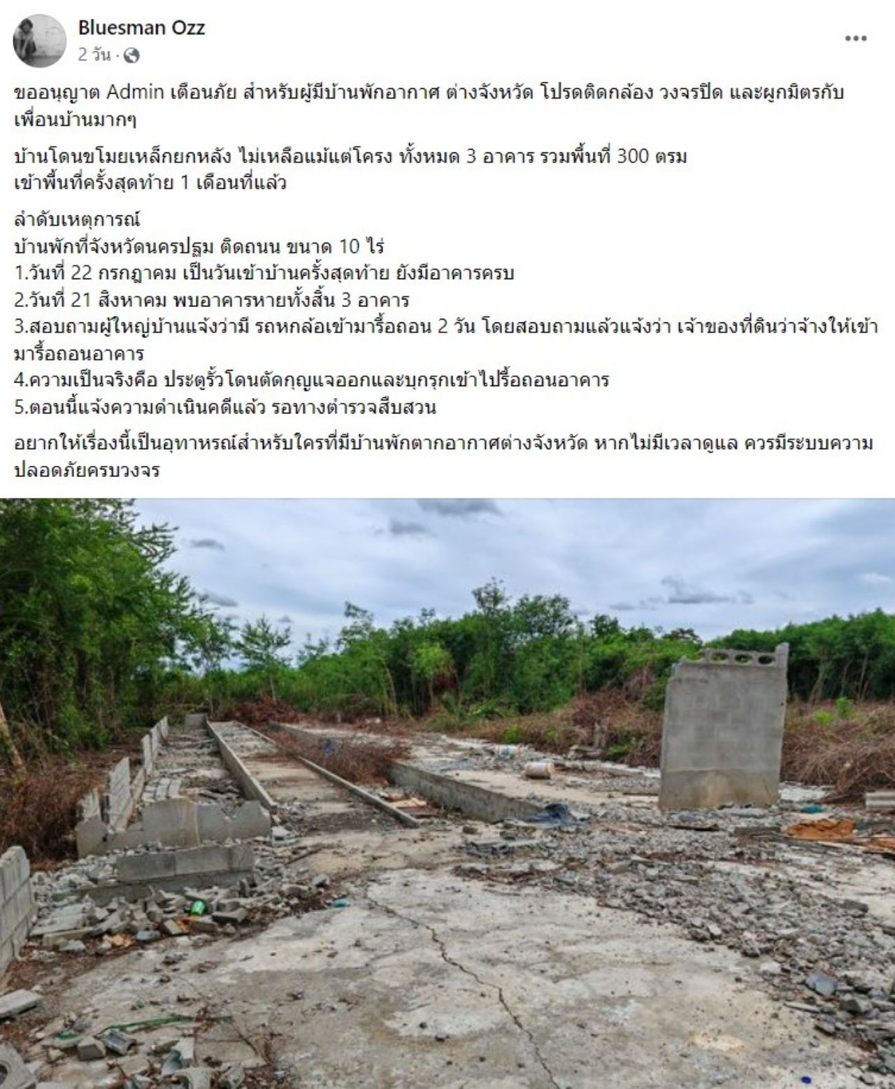 ความเป็นจริงคือ ประตูรั้วโดนตัดกุญแจออก และบุกรุกเข้าไปรื้อถอนอาคาร ตอนนี้แจ้งความดำเนินคดีแล้ว รอทางตำรวจสืบสวน อยากให้เรื่องนี้เป็นอุทาหรณ์ สำหรับใครที่มีบ้านพักตากอากาศต่างจังหวัด หากไม่มีเวลาดูแล ควรมีระบบความปลอดภัยครบวงจร