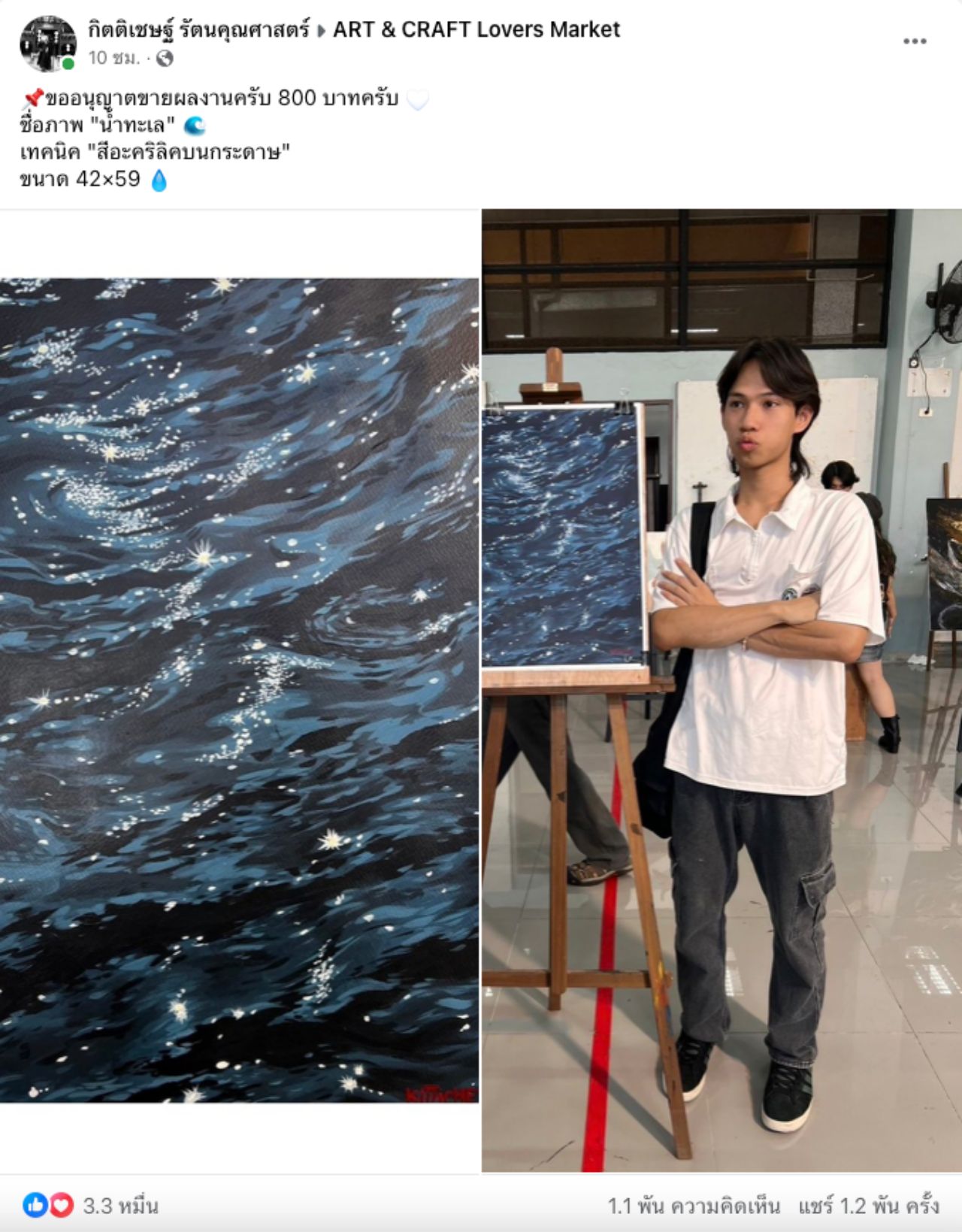 ทั้งนี้ หลังจากโพสต์ดังกล่าวถูกเผยแพร่ออกไป ก็เป็นที่สนใจของผู้คนจำนวนมาก จนมีคนมากดถูกใจกว่า 3 หมื่นครั้ง ซึ่งเจ้าของโพสต์ได้คอมเมนต์ข้อความเพิ่มเติมว่า "ผลงานนี้ขายแล้วนะครับ" และมีคนเข้ามาคอมเมนต์เป็นจำนวนมาก อาทิ ถ้าเปิดประมูลแทน 800 น่าจะได้เยอะเลย ภาพเกินราคามาก, ฝีมือเกินตัวค่ะ, ขายถูกมากครับ, ชอบมาก, มองไกลๆ สวยมาก เหมือนน้ำทะเลจริงๆ เลย, 800 ถูกมาก ภาพสวยมากเลยค่ะ เป็นต้น