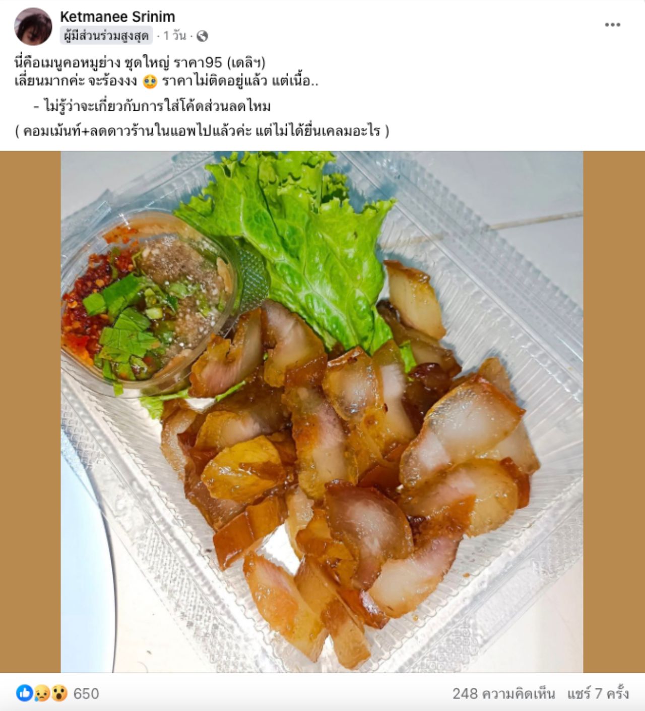 กลายเป็นโพสต์ที่ถูกพูดถึงในโลกออนไลน์ เมื่อผู้ใช้เฟซบุ๊ก Ketmanee Srinim ได้โพสต์ภาพเมนู "คอหมูย่าง" ผ่านกลุ่ม พวกเราคือผู้บริโภค พร้อมระบุข้อความว่า "นี่คือเมนูคอหมูย่าง ชุดใหญ่ราคา 95 บาท สั่งเดลิเวอรี่ เลี่ยนมากค่ะจะร้อง ราคาไม่ติดอยู่แล้ว ไม่รู้ว่าจะเกี่ยวกับการใส่โค้ดส่วนลดไหม คอมเมนต์+ลดดาวร้านในแอปฯ ไปแล้วค่ะ แต่ไม่ได้ยื่นเคลมอะไร"