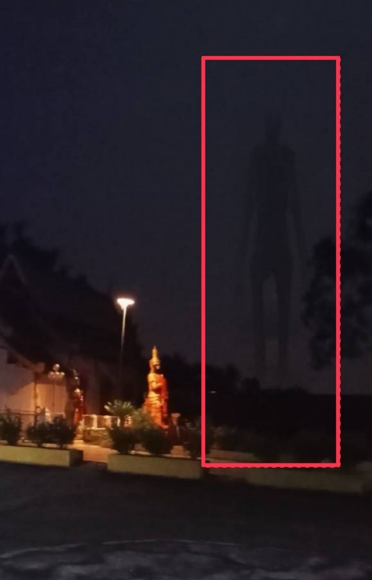 ระหว่างนั้นได้ยินเสียงนกแสกร้องดังขึ้น และมีเงาดำเกิดขึ้นบริเวณทิศตะวันออกทุ่งนาติดวัด เลยกดบันทึกภาพนิ่ง จากนั้นได้ยินเสียงสุนัขเห่าหอนวิ่งไปตามถนนหายไปทางดอยโป่งหมื่น จึงได้มาดูภาพก็พบว่ามีเปรตยืนอยู่ในภาพ ทำให้ขนลุกจึงได้นำภาพมาให้เจ้าอาวาสดู