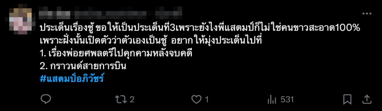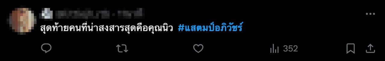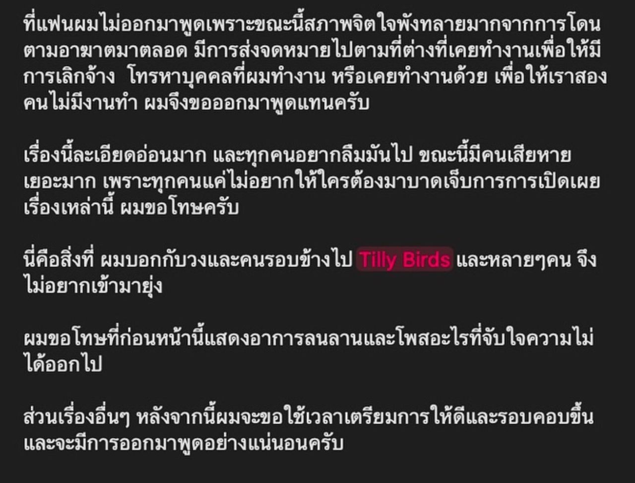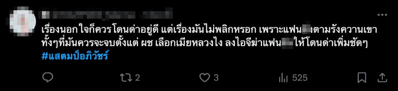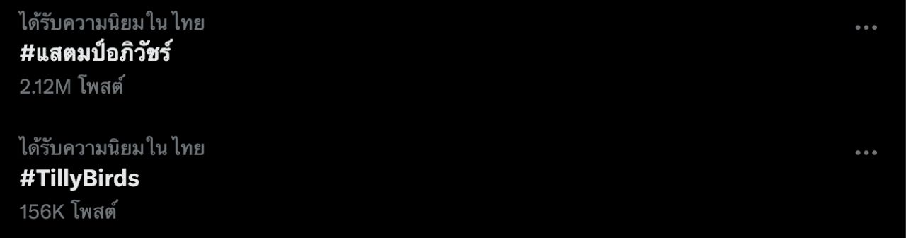 ทั้งนี้ เรื่องของ แสตมป์ อภิวัชร์ ได้ถูกพูดถึงเป็นอย่างมากตั้งแต่เมื่อวานนี้ จนทำให้ #แสตมป์อภิวัชร์ อยู่อันดับ 1 ในเอ็กซ์ (x) ขณะที่แฮชแท็ก #TillyBirds ก็ตามมาติดๆ เป็นอันดับ 2 เนื่องจากแฟนของสาวคู่กรณีครอบครัว แสตมป์ อภิวัชร์ ทำงานเป็นซาวน์เอนจิเนียร์ ประจำวงให้กับ TillyBirds