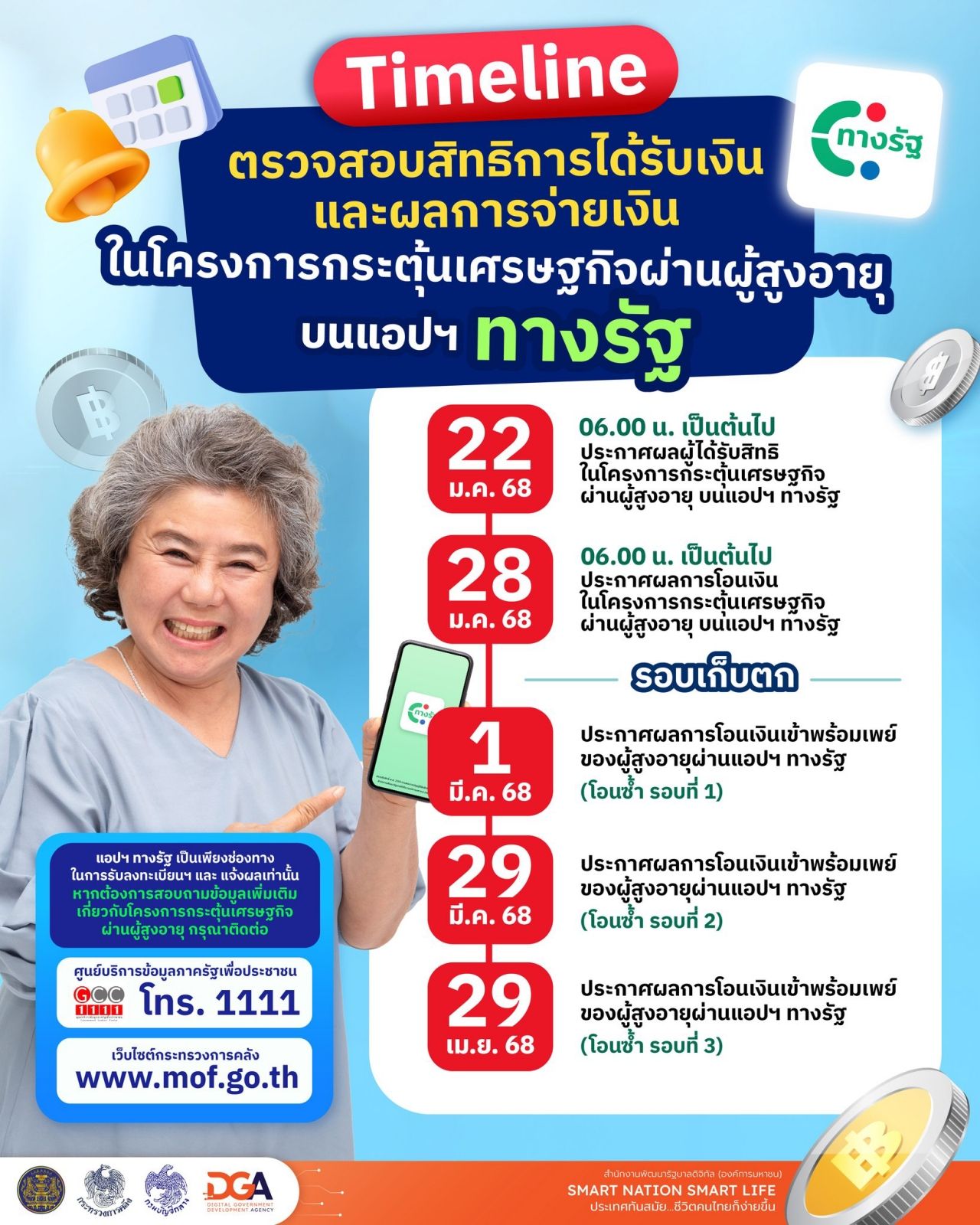 ตามที่คณะรัฐมนตรี (ครม.) มีมติเห็นชอบโครงการกระตุ้นเศรษฐกิจผ่านผู้สูงอายุ โดยภาครัฐจะสนับสนุนเงินจำนวน 10,000 บาท ในเฟส 2 ให้กับผู้ที่มีอายุ 60 ปีขึ้นไปกว่า 4 ล้านคน ซึ่งเปิดให้ตรวจสอบสิทธิตั้งแต่วันที่ 22 มกราคม 2568 ที่ผ่านมา ผ่านแอปพลิเคชัน "ทางรัฐ"