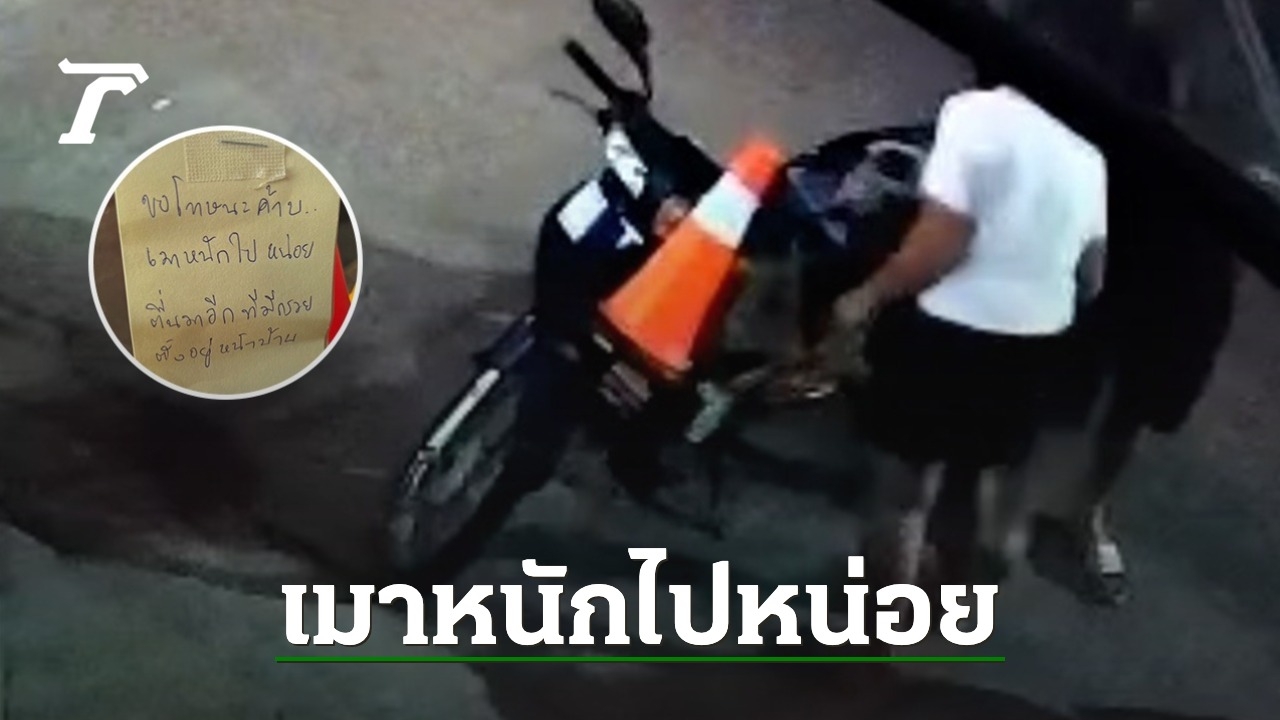 เจ้าของร้านโพสต์คลิป ตามหาสาวยกกรวยสีส้มหน้าร้านขึ้น จยย. ก่อนขี่กลับ มาอีกวันเอามาคืน พร้อมป้ายขอโทษ สารภาพเมาหนักไปหน่อย