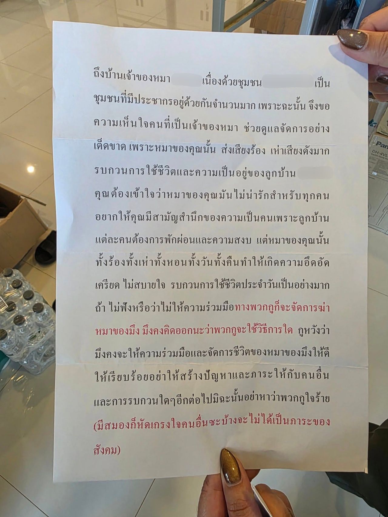 ก่อนหน้านี้ ตนวางแผนว่าจะส่งหมาไปอยู่ที่ กทม. อยู่แล้ว เพราะทราบว่าหมาส่งเสียงดังรบกวนเพื่อนบ้าน แต่เมื่อมาเจอจดหมายขู่แบบนี้ ก็เลยค่อนข้างตกใจ ที่จริงมาบอกเราดีๆ ก็ได้ เราก็พร้อมจะแก้ไขให้อยู่แล้ว เพราะเราก็คิดว่าเราก็มีส่วนผิด แต่หลังจากได้อ่านจดหมายจบ ตนก็รู้สึกไม่สบายใจ จึงรีบติดต่อรถขนส่งให้พาไปส่ง กทม. ทันทีในตอนเย็นนั้นเลย เสียค่าขนส่งไป 3,000 บาท หลังจากได้ส่งหมาไปแล้ว ตอนนี้ก็รู้สึกโล่งใจ และอยากจะขอโทษเพื่อนบ้านที่หมาของตนเคยส่งเสียงดังรบกวน