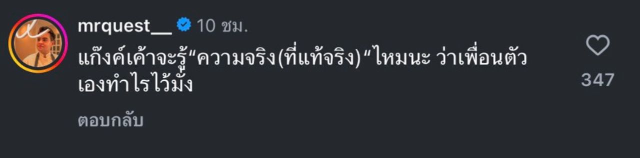 ขณะที่ เชฟเควส ซึ่งเป็นเพื่อนสนิท จากรายการมาสเตอร์เชฟ ก็ได้เข้ามาแสดงความคิดเห็นด้วยว่า "แก๊งเค้าจะรู้ความจริง (ที่แท้จริง) ไหมนะ ว่าเพื่อนตัวเองทำอะไรไว้บ้าง"