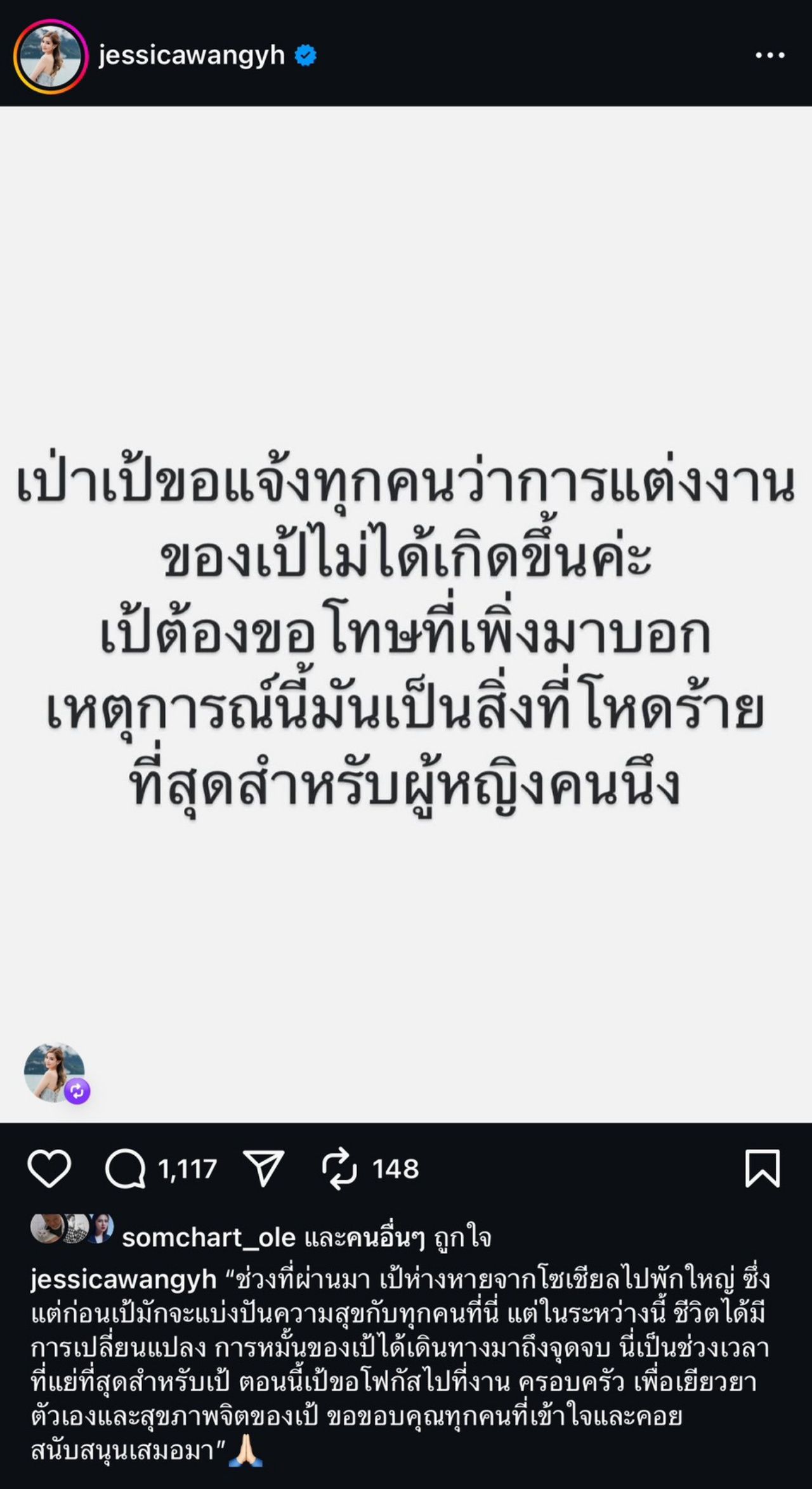 วันที่ 3 เม.ย. 68 ทำเอาช็อกไปตามๆ เมื่อ "เป่าเป้ เจสสิก้า หวัง" ผู้เข้าแข่งขันมาสเตอร์เชฟ ได้โพสต์ข้อความผ่านไอจีบอกว่า การแต่งงานของเป้ไม่ได้เกิดขึ้น พร้อมกับขอโทษทุกคน และบอกด้วยว่าเหตุการณ์ที่เกิดขึ้นเป็นสิ่งที่โหดร้ายที่สุดสำหรับผู้หญิงคนหนึ่ง