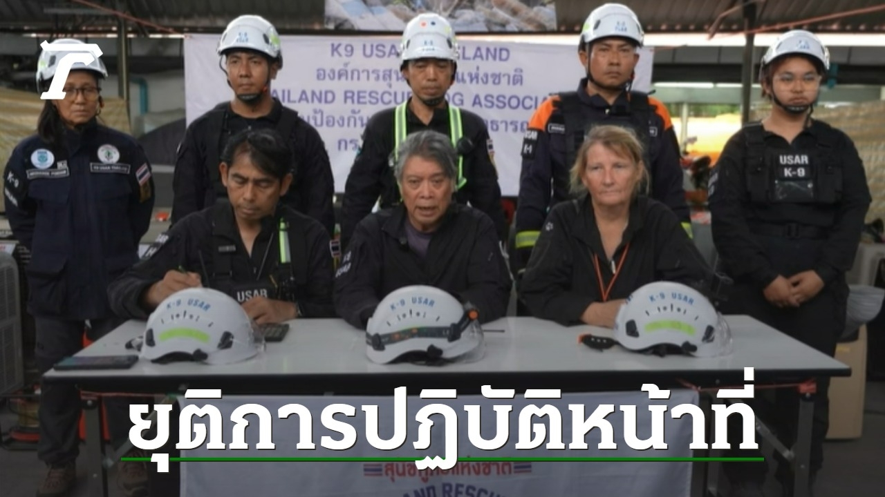 ทีม K9 USAR THAILAND แถลงหยุดปฏิบัติภารกิจช่วยผู้ติดค้างในตึก สตง. ส่งมอบการค้นหาให้แก่เจ้าหน้าที่ต่อไป ยืนยันทั้งเจ้าหน้าที่-สุนัข ปลอดภัยทั้งหมด ขอบคุณทุกฝ่ายที่สนับสนุนและดูแลตลอดมา