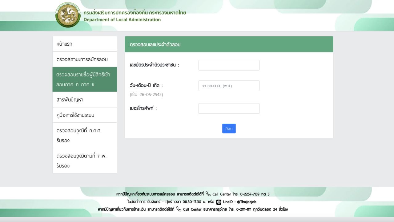 หากผู้สมัครสอบที่ได้ดำเนินการสมัครสอบและชำระค่าธรรมเนียมแล้ว แต่ไม่มีชื่อเป็นผู้มีสิทธิสอบตามประกาศ ให้ติดต่อเจ้าหน้าที่ทางโทรศัพท์หมายเลข