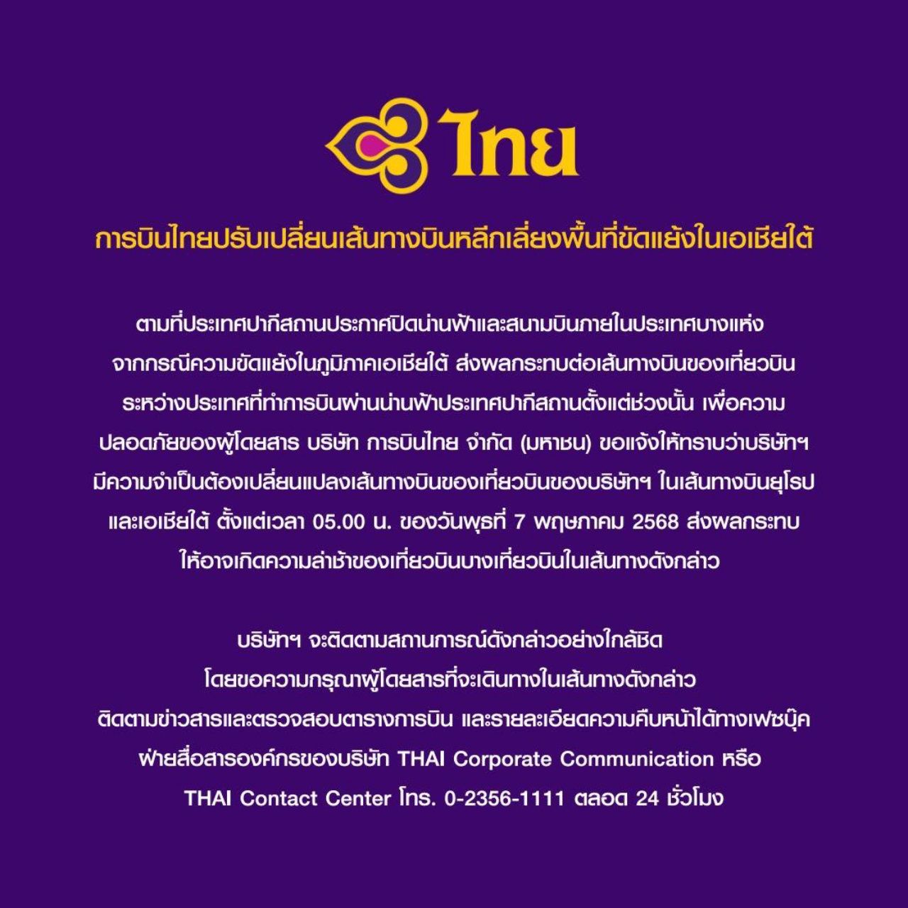 เพื่อความปลอดภัยของผู้โดยสาร บริษัท การบินไทย จำกัด (มหาชน) ขอแจ้งให้ทราบว่าบริษัทมีความจำเป็นต้องเปลี่ยนแปลงเส้นทางบินของเที่ยวบินของบริษัทฯ ในเส้นทางบินยุโรปและเอเชียใต้ ตั้งแต่เวลา 05.00 น. ของวันพุธที่ 7 พฤษภาคม 2568 ส่งผลกระทบให้อาจเกิดความล่าช้าของเที่ยวบินบางเที่ยวบินในเส้นทางดังกล่าว