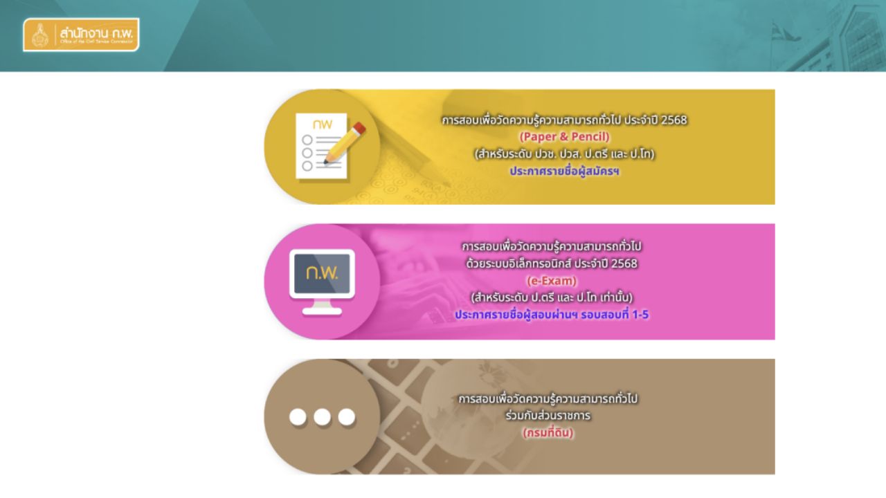 "สอบ ก.พ. 68" ประกาศรายชื่อผู้สอบผ่านการวัดความรู้ความสามารถทั่วไปด้วยระบบอิเล็กทรอนิกส์ (e-Exam) ประจำปี 2568 รอบสอบที่ 1 - 5