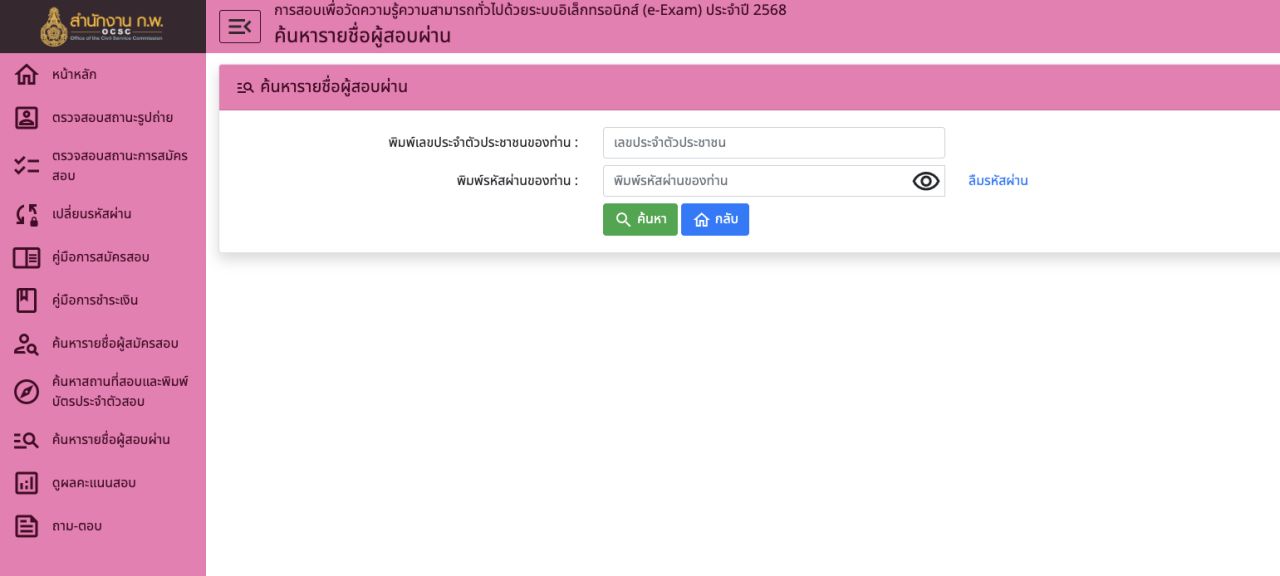4. ผู้ที่สอบผ่านการวัดความรู้ความสามารถทั่วไปของสำนักงาน ก.พ. สามารถพิมพ์หนังสือรับรองผลการสอบผ่านการวัดความรู้ความสามารถทั่วไปของสำนักงาน ก.พ. ได้ทางเว็บไซต์ https://job.ocsc.go.th/ หัวข้อ "พิมพ์หนังสือรับรองผลการสอบผ่าน" โดยกรอกเลขประจำตัวประชาชน 13 หลัก พร้อม password เพื่อยืนยันสถานะผู้สอบผ่านได้ตั้งแต่วันที่ 26 พฤษภาคม 2568 เป็นต้นไป