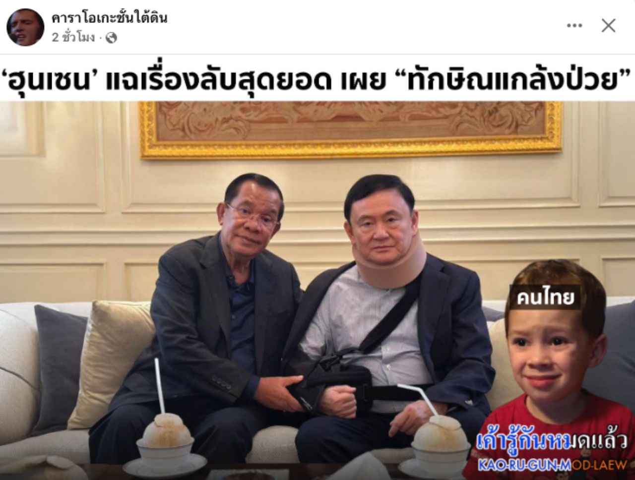 ล่าสุด วันที่ 27 มิ.ย. 2568 สมเด็จฯ ฮุน เซน กล่าวในระหว่างการไลฟ์สดตอนหนึ่งว่า นายทักษิณแกล้งทำตัวป่วย เพื่อหลบเลี่ยงกระบวนการของศาลในหลายคดี ตอนที่ไปเยี่ยมอาการป่วยของทักษิณเมื่อวันที่ 21 ก.พ. 2024 นั้น ทักษิณไม่ได้มีอาการป่วยใดๆ เลย แต่พอถ่ายภาพร่วมกับสมเด็จฯ กลับสวมใส่อุปกรณ์ของผู้ป่วยเพื่อหลอกลวงประชาชนและเจ้าหน้าที่ไทย สมเด็จกล่าวว่า ตอนที่ไปเยี่ยมนั้น ไม่ได้รู้เลยว่าทักษิณแกล้งป่วย แต่พอจะถ่ายรูปเลยต้องเอาเฝือกคอและผ้าคล้องแขนมาใส่ แต่พอถ่ายเสร็จแล้วก็ถอดและออกไปรับประทานอาหาร ("ฮุน เซน" แฉ "ทักษิณ" แกล้งป่วย ทำเพราะ "ลูกสาวทักษิณ" ขาดคุณธรรม)