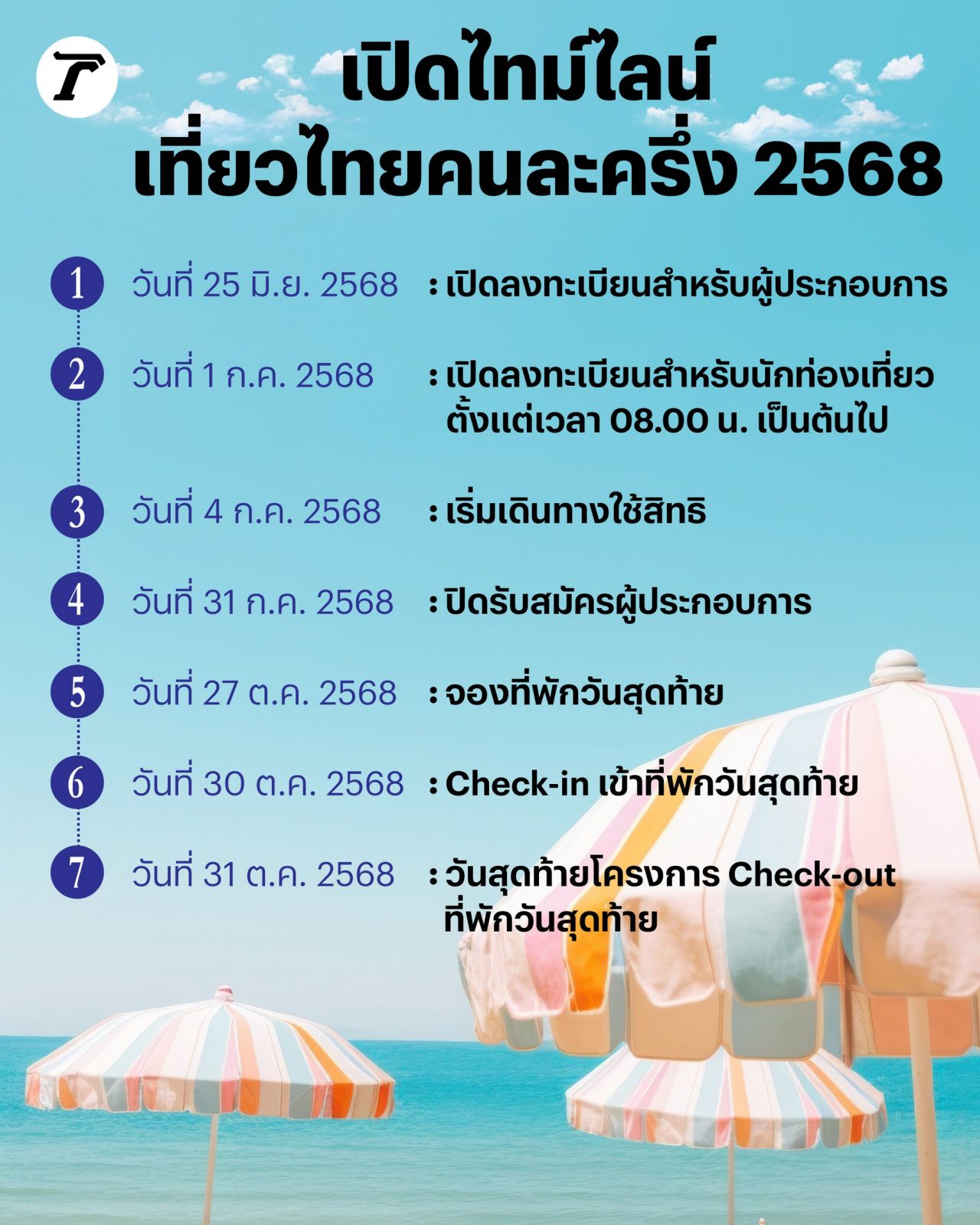 - สำหรับประชาชนทั่วไป เริ่มลงทะเบียนโครงการเที่ยวไทยคนละครึ่ง ได้ตั้งแต่วันที่ 1 ก.ค. - 31 ต.ค. 2568