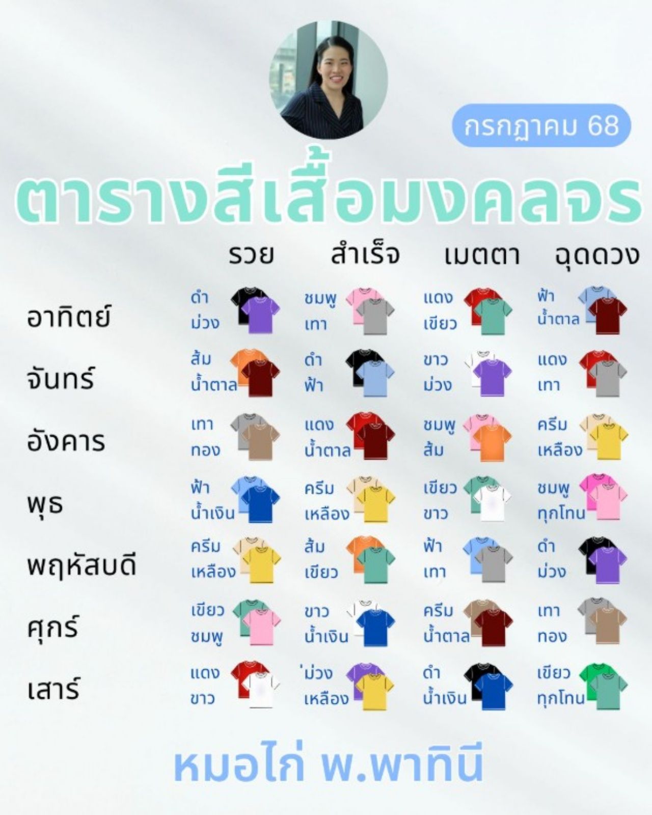 ล่าสุด วันที่ 1 กรกฎาคม 2568 หมอไก่ พ.พาทินี เผยว่า "สำหรับวันอังคาร ตลอดเดือนกรกฎาคม เสื้อสีเขียวเป็นสีฉุดดวง แม้ว่าจะไม่แรง แต่ไม่ควรใส่ในวันสำคัญ โดยสีฉุดดวงแรงจัด อันดับ 1 คือ สีขาว เหลือง ครีม สีฉุดดวงไม่ควรใส่ อันดับ 2 คือ สีเขียว ฟ้า น้ำเงิน"