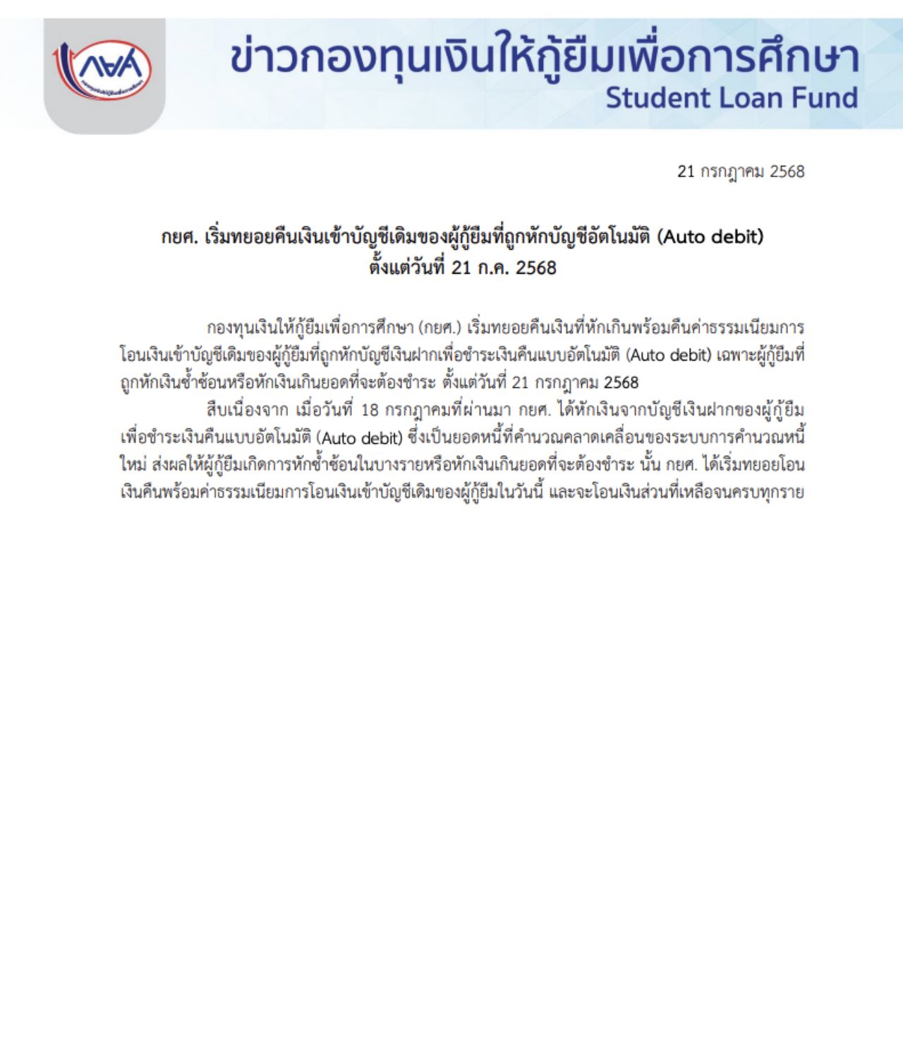 ความคืบหน้าล่าสุด กองทุนเงินให้กู้ยืมเพื่อการศึกษา (กยศ.) เริ่มทยอยคืนเงินที่หักเกินพร้อมคืนค่าธรรมเนียมการโอนเงินเข้าบัญชีเดิมของผู้กู้ยืมที่ถูกหักบัญชีเงินฝากเพื่อชำระเงินคืนแบบอัตโนมัติ (Auto debit) เฉพาะผู้กู้ยืมที่ถูกหักเงินซ้ำซ้อนหรือหักเงินเกินยอดที่จะต้องชำระ ตั้งแต่วันที่ 21 กรกฎาคม 2568
