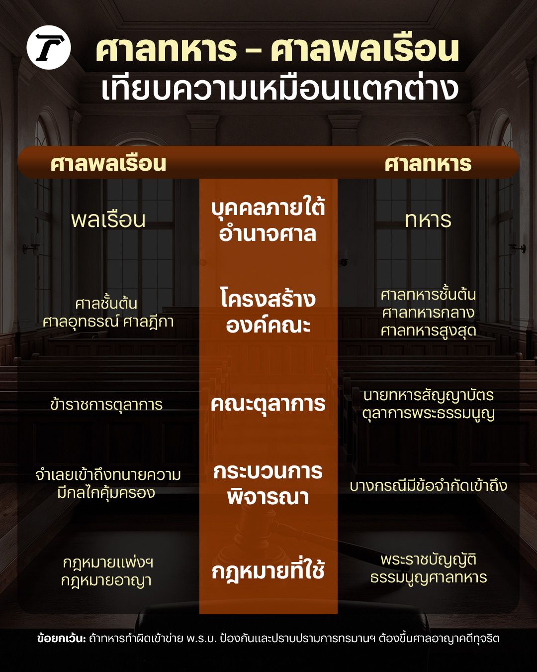 ศาลทหาร-ศาลพลเรือน เทียบความเหมือนและความต่าง ขั้นตอนพิจารณาคดี "สภาทนาย" ชี้โทษอาญาใช้กฎหมายพิจารณาเล่มเดียวกัน แต่ทหารมีธรรมนูญทหาร ที่ต้องมีการพิจารณาเพิ่มเติมบางกรณี