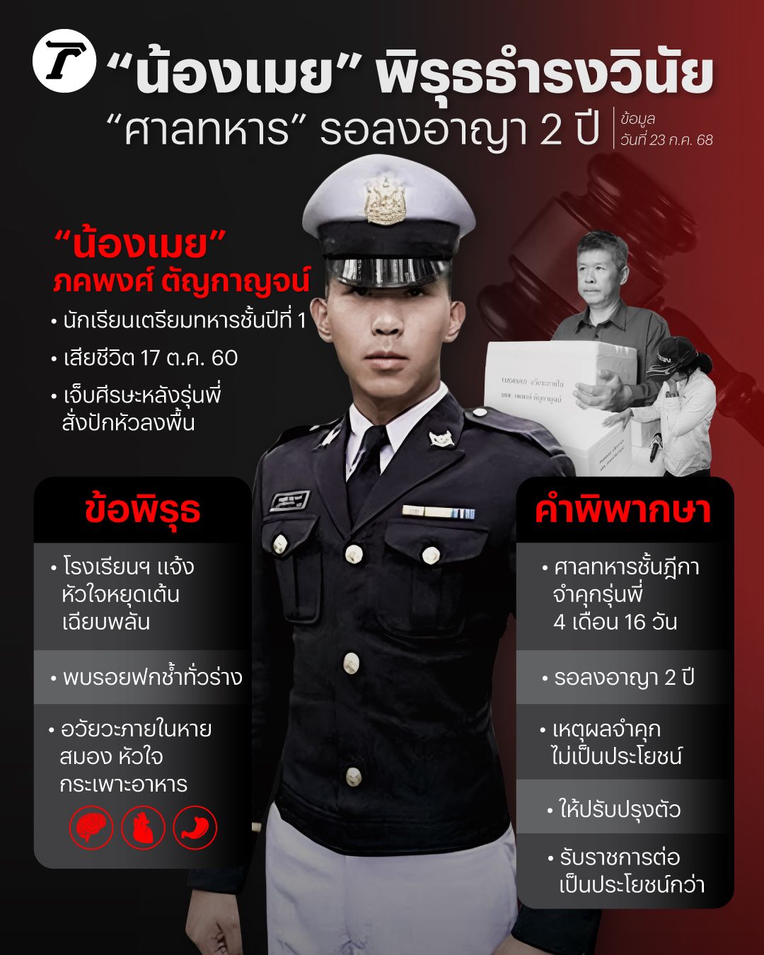 "น้องเมย" พิรุธ 2 รุ่นพี่เตรียมทหารสั่งธำรงวินัย ครอบครัวต่อสู้ 8 ปี บทสรุปศาลทหาร รอลงอาญา 2 ปี ให้รับราชการต่อ ครอบครัวกังขา อวัยวะภายในหาย ผบ.ตร. ยันสั่งจเรตำรวจฯ พิจารณาวินัยรุ่นพี่ ที่ตอนนี้รับราชการตำรวจ