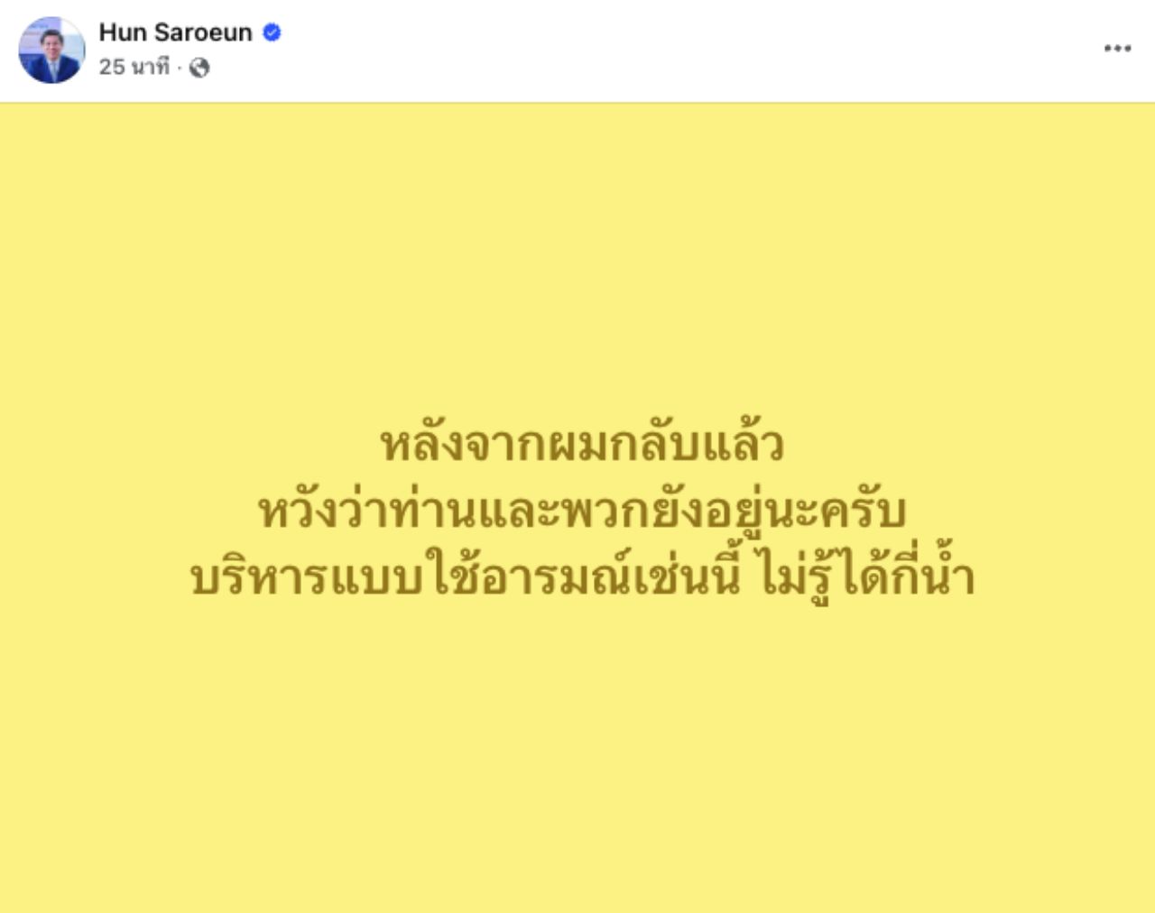 ซึ่งต่อมา นายฮุน ซาเรือน (H.E. Mr. Hun Saroeun) เอกอัครราชทูตกัมพูชาประจำประเทศไทย ได้โพสต์ข้อความผ่านเฟซบุ๊กว่า Hun Saroeun ระบุว่า “หลังจากผมกลับแล้ว หวังว่าท่านและพวกยังอยู่นะครับ บริหารแบบใช้อารมณ์เช่นนี้ ไม่รู้ได้กี่น้ำ” (อ่านข่าว : เปิดโพสต์ “ทูตกัมพูชา” เคลื่อนไหวแล้ว หลังไทยตอบโต้เหตุทหารเหยียบกับระเบิด)