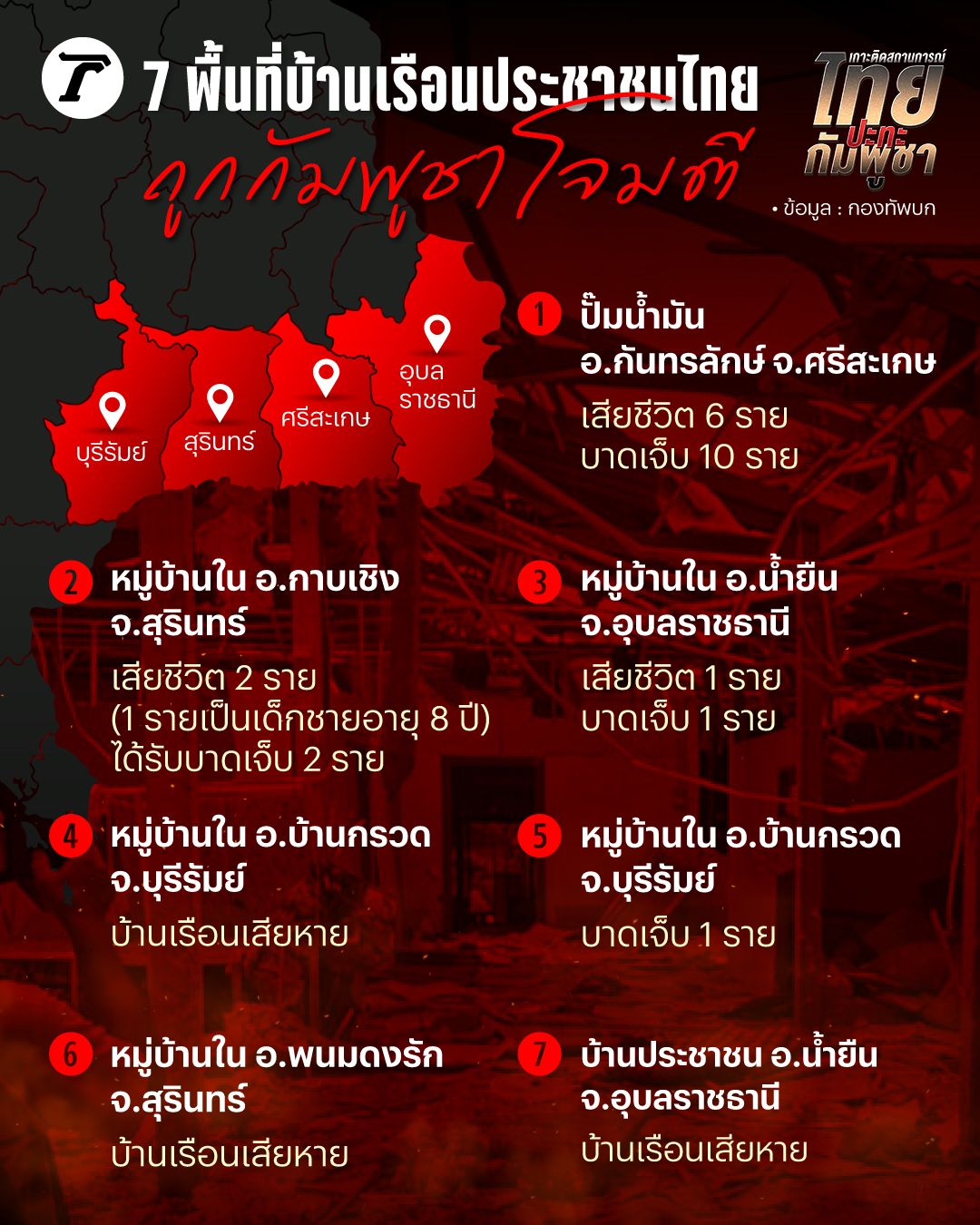กองทัพบก ระบุ 7 พื้นที่บ้านเรือนประชาชนไทย ถูกกัมพูชาโจมตี ดังนี้