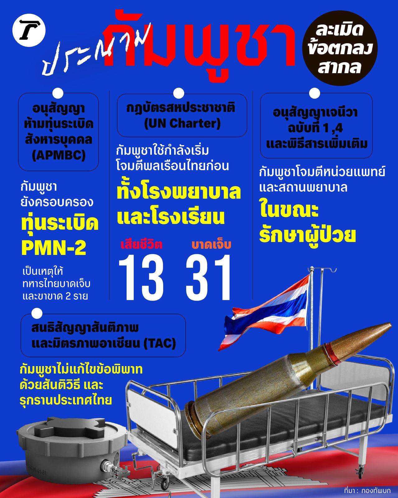 ทีมข่าวเฉพาะกิจไทยรัฐออนไลน์ รวบรวมข้อตกลงระหว่างประเทศที่ฝ่ายกัมพูชาละเมิด จนอาจนำไปสู่การถูกทั่วโลกประณามการกระทำลักษณะนี้ได้ ซึ่งฝั่งไทยได้รายงานไปยัง UN แล้ว