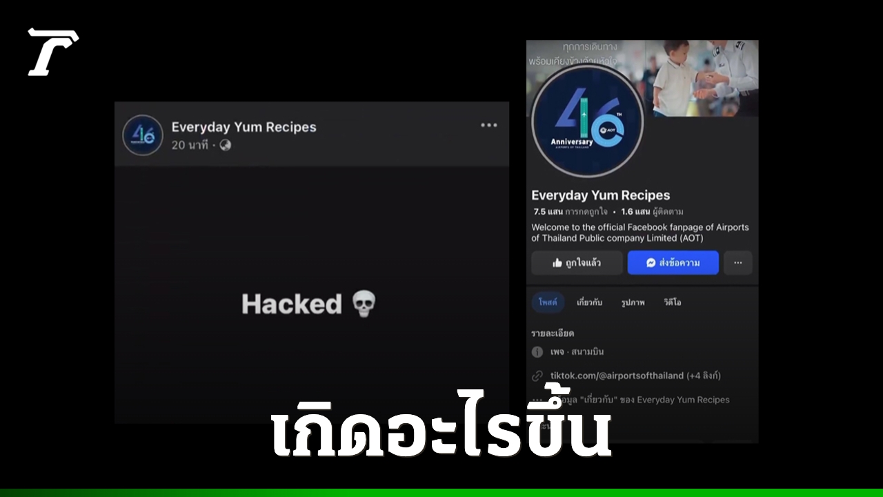 วันที่ 16 ส.ค. 68 มีรายงานว่า เพจเฟซบุ๊ก AOT Official ของบริษัท ท่าอากาศยานไทย จำกัด (มหาชน) หรือ ทอท. ถูกเปลี่ยนชื่อเพจเป็น Everyday Yum Recipes พร้อมกับโพสต์ข้อความว่า "HACKED" และอิโมติคอนหัวกะโหลก