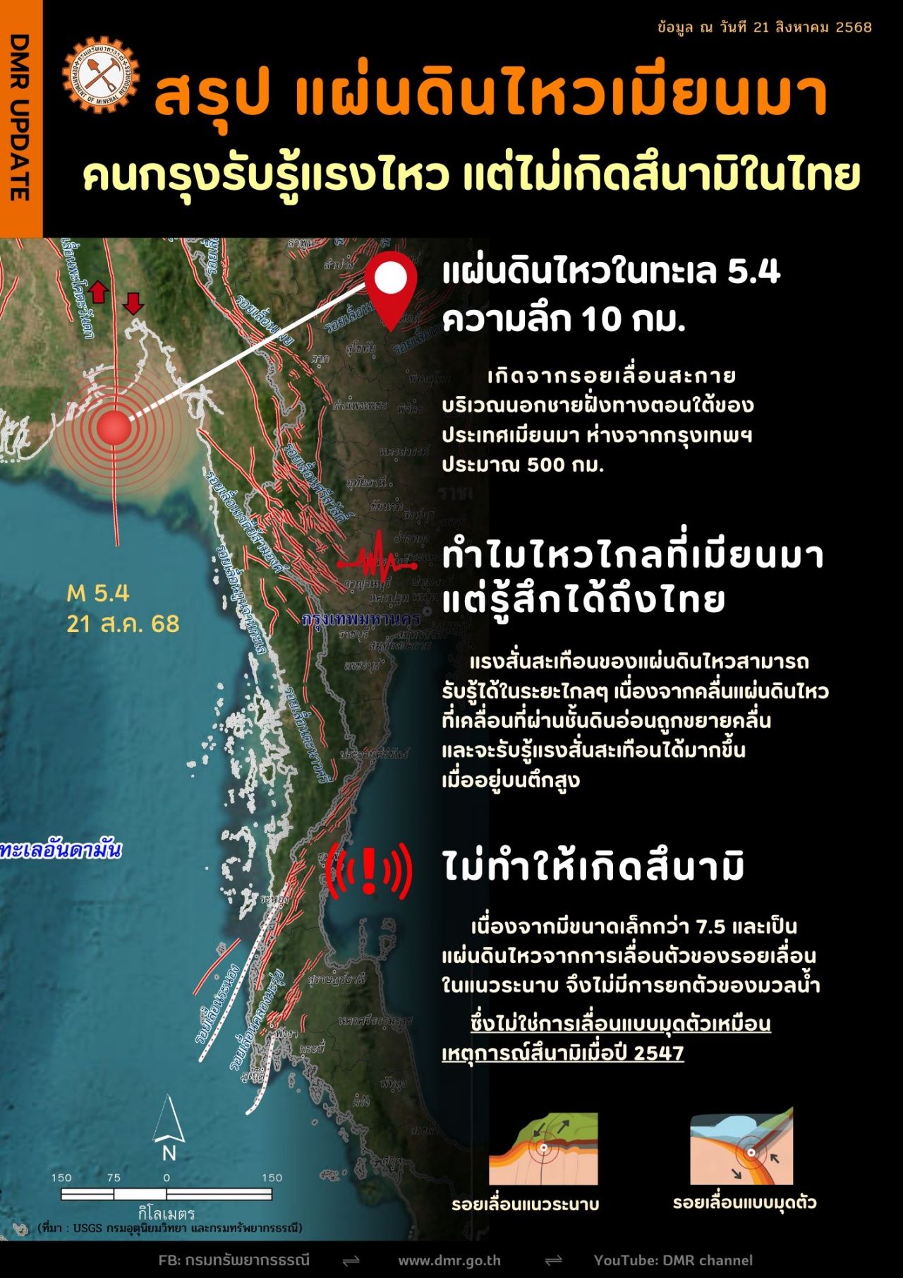 วันที่ 21 ส.ค. 68 มีรายงานว่า กรมทรัพยากรธรณี ได้สรุปเหตุการณ์แผ่นดินไหวจากรอยเลื่อนสะกาย ประเทศเมียนมา โดยระบุว่า เหตุการณ์แผ่นดินไหว วันที่ 21 ส.ค. 68 เวลา 09.58 น. (ตามเวลาในประเทศไทย) เกิดแผ่นดินไหวในทะเลขนาด 5.4 ที่ระดับความลึก 10 กิโลเมตร จุดเหนือศูนย์เกิดแผ่นดินไหวอยู่ในทะเลบริเวณนอกชายฝั่งทางตอนใต้ของประเทศเมียนมา ห่างจากกรุงเทพมหานครประมาณ 500 กิโลเมตร ส่งผลให้ประชาชนที่อาศัยอยู่บนตึกสูงในกรุงเทพมหานครรับรู้ถึงแรงสั่นสะเทือน