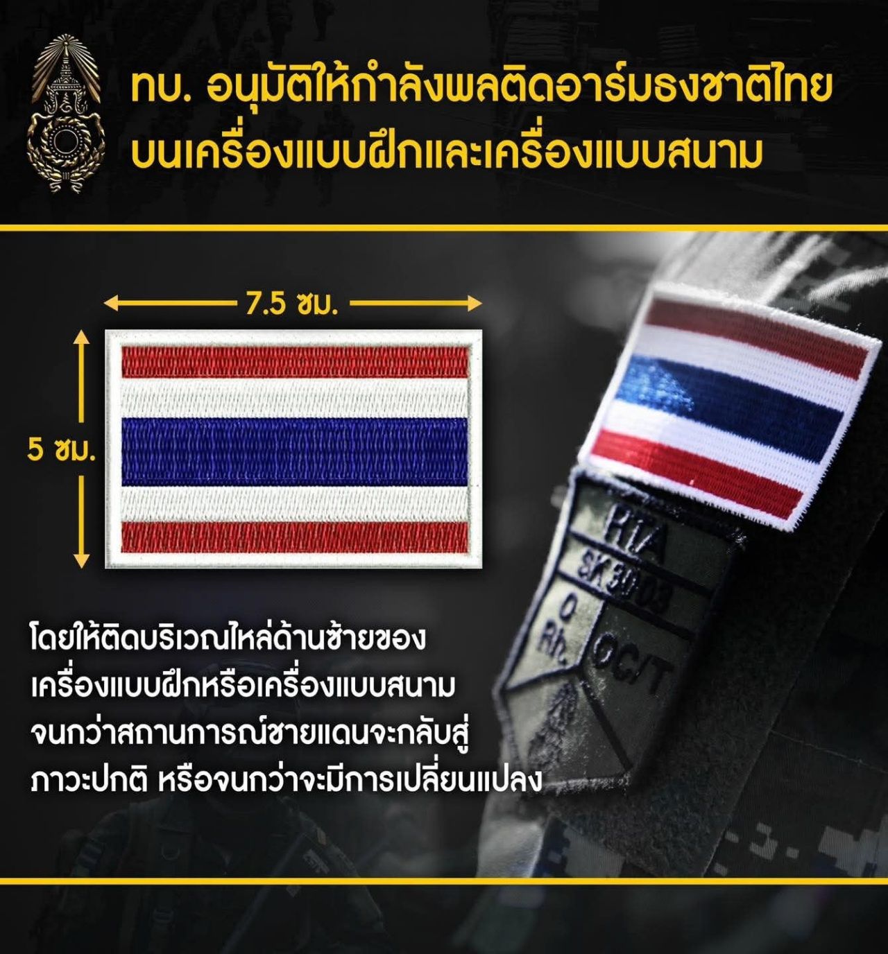 กองทัพบก อนุมัติให้กำลังพลประดับแผ่นธงชาติไทยบนบ่าชุดฝึกและชุดสนาม เพื่อสะท้อนอัตลักษณ์ของทหารไทย ปลูกฝังอุดมการณ์ ความรักชาติ ความสามัคคี และแสดงออกถึงเกียรติยศ ศักดิ์ศรีของนักรบทุกนาย