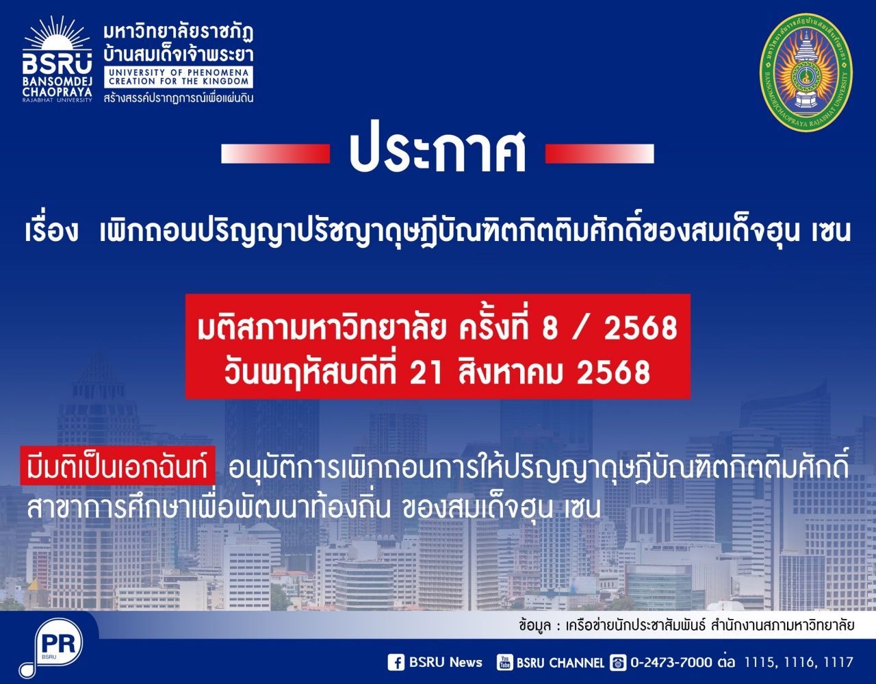 วันที่ 22 สิงหาคม 2568 มีรายงานว่า มหาวิทยาลัยราชภัฏบ้านสมเด็จเจ้าพระยา ประกาศ เรื่อง เพิกถอนปริญญาปรัชญาดุษฎีบัณฑิตกิตติมศักดิ์ของสมเด็จฮุน เซน โดยระบุว่า มติสภามหาวิทยาลัย ครั้งที่ 8 / 2568 วันพฤหัสบดีที่ 21 สิงหาคม 2568 มีมติเป็นเอกฉันท์ อนุมัติการเพิกถอนการให้ปริญญาดุษฎีบัณฑิตกิตติมศักดิ์ สาขาการศึกษาเพื่อพัฒนาท้องถิ่น ของสมเด็จฮุน เซน