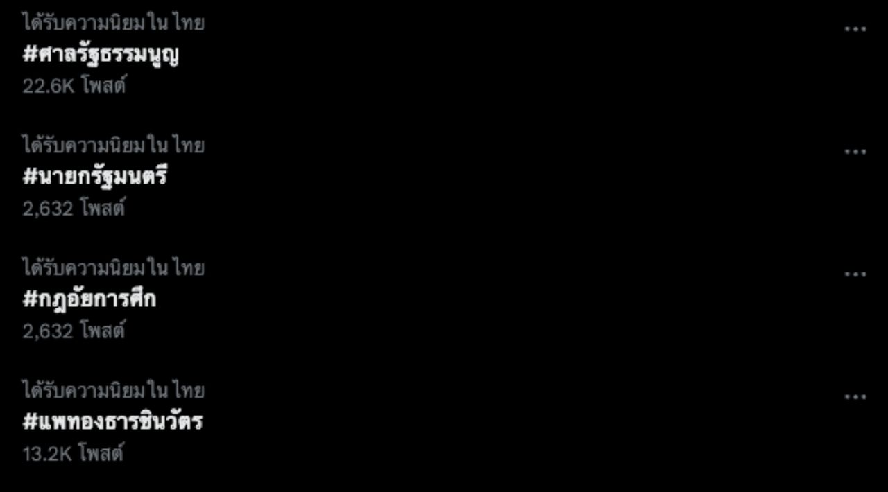 ทั้งนี้ ทำให้มีคนพูดถึงประเด็นดังกล่าวเป็นจำนวนมาก ส่งผลให้แฮชแท็ก #แพทองธารชินวัตร พุ่งติดเทรนด์ในทวิตเตอร์ (X) รวมทั้งแฮชแท็ก #นายกรัฐมนตรี และ #ศาลรัฐธรรมนูญ ก็พุ่งติดเทรนด์ด้วยเช่นกัน.