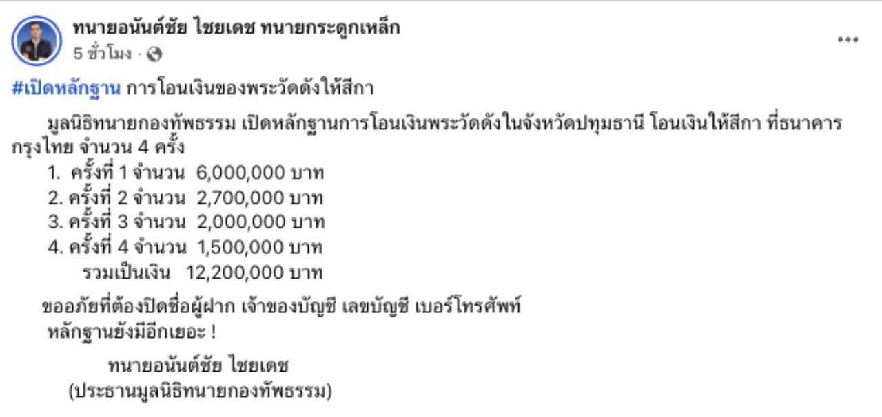 วันที่ 14 กันยายน 2568 มีรายงานว่า นายอนันต์ชัย ไชยเดช ทนายความชื่อดัง และประธานมูลนิธิทนายกองทัพธรรม ได้โพสต์ภาพหลักฐานการโอนเงินที่อ้างว่า พระวัดดังใน จ.ปทุมธานี โอนเงินให้กับสีกา โดยระบุข้อความว่า “เปิดหลักฐาน การโอนเงินของพระวัดดังให้สีกา
