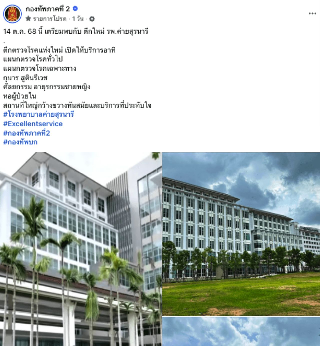 วันที่ 18 กันยายน 2568 มีรายงานว่า แฟนเพจ กองทัพภาคที่ 2 ได้โพสต์ภาพและข้อความว่า ในวันที่ 14 ตุลาคม 2568 เตรียมพบกับ ตึกใหม่ของ โรงพยาบาลค่ายสุรนารี