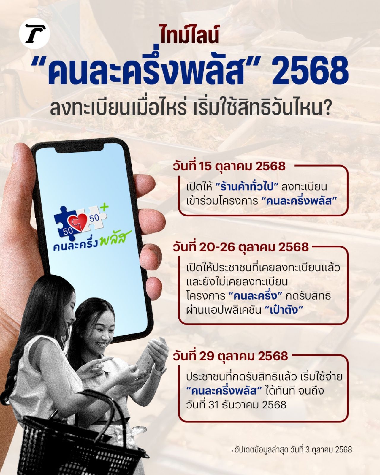โดยจะเริ่มใช้จ่าย "คนละครึ่งพลัส" ได้ตั้งแต่ 29 ตุลาคม 2568 ไปจนถึงวันที่ 31 ธันวาคม 2568 หากใช้ไม่ถึง 200 บาท สามารถสะสมได้.