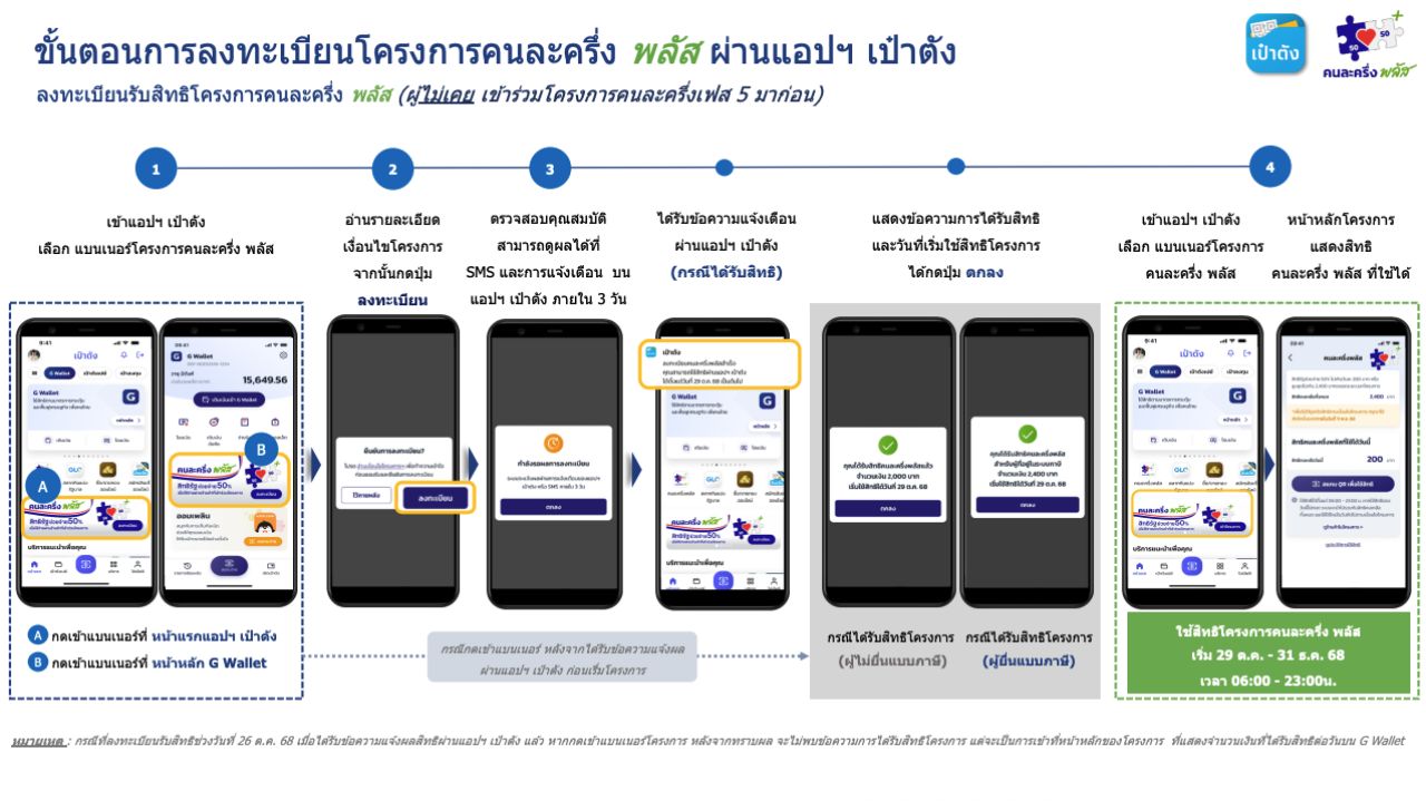 ประชาชนทั่วไป สามารถลงทะเบียนเข้าร่วมโครงการคนละครึ่งพลัส ผ่านแอปฯ เป๋าตัง ได้ตั้งแต่วันที่ 20 - 26 ตุลาคม 2568 เวลา 06.00 - 22.00 น.