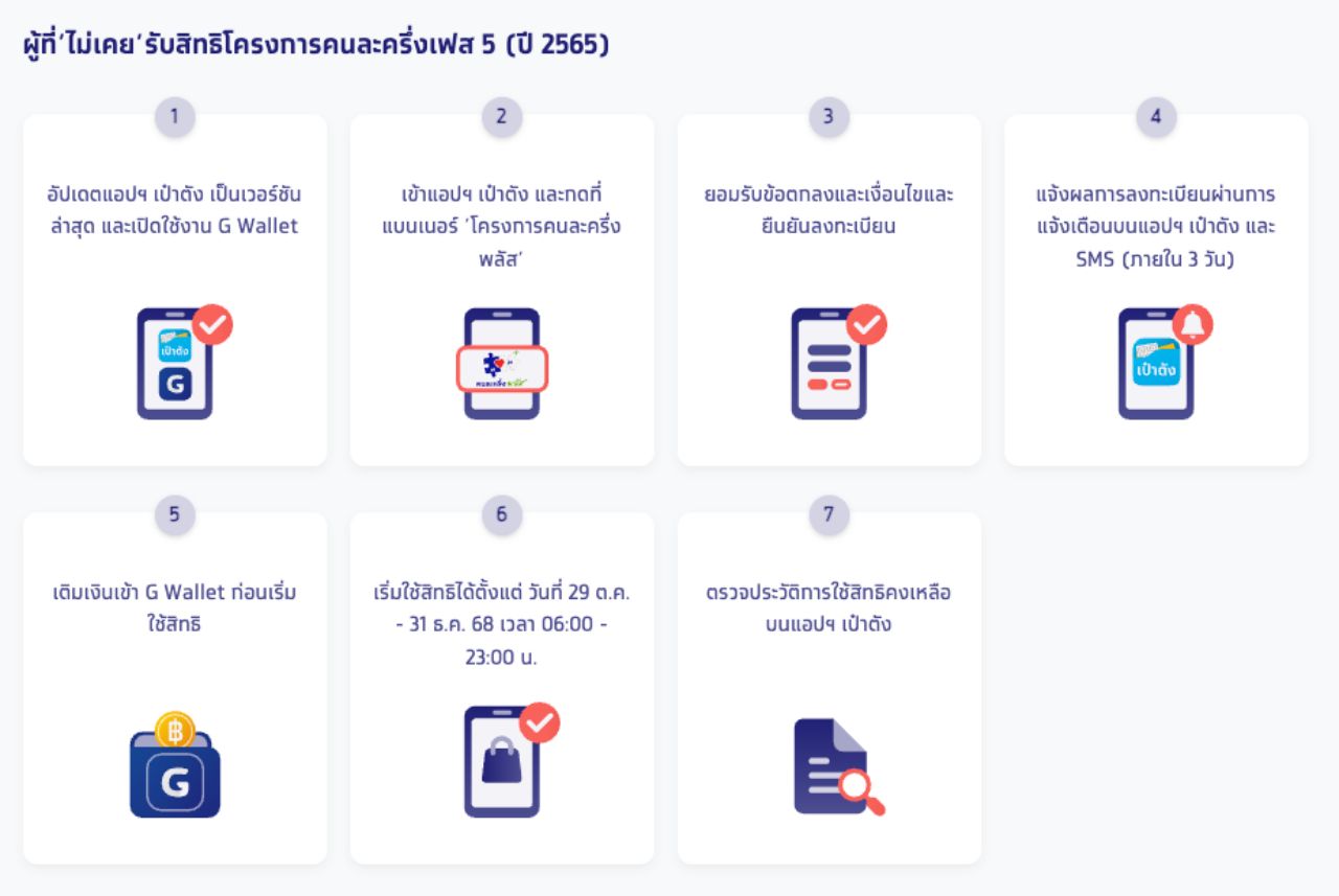 (1) โครงการคนละครึ่ง (2) โครงการคนละครึ่ง ระยะที่ 2 (3) โครงการคนละครึ่ง ระยะที่ 3 (4) โครงการคนละครึ่ง ระยะที่ 4 และ (5) โครงการคนละครึ่ง ระยะที่ 5
