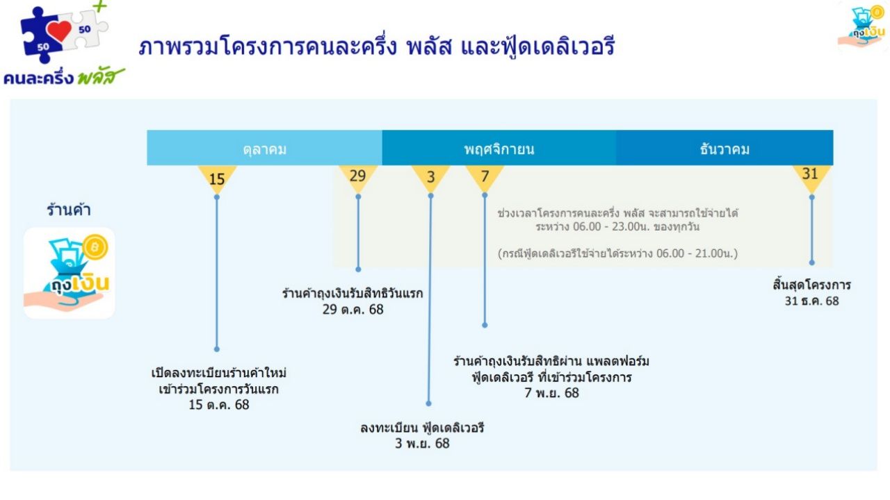 ไทม์ไลน์โครงการ "คนละครึ่งพลัส" ปี 2568 สำหรับร้านค้าและฟู้ดเดลิเวอรี มีรายละเอียด ดังนี้