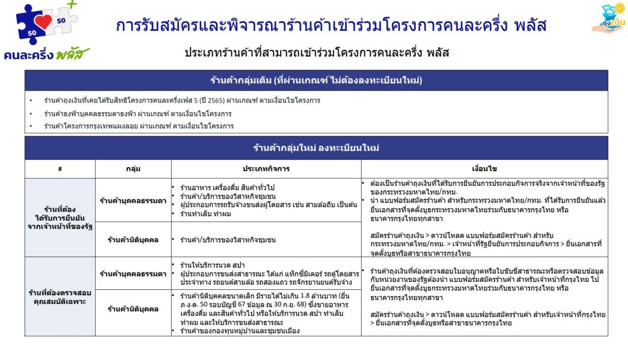 - ร้านค้าถุงเงินที่เคยได้รับสิทธิโครงการคนละครึ่ง เฟส 5 (ปี 2565) ผ่านเกณฑ์ตามเงื่อนไขโครงการ